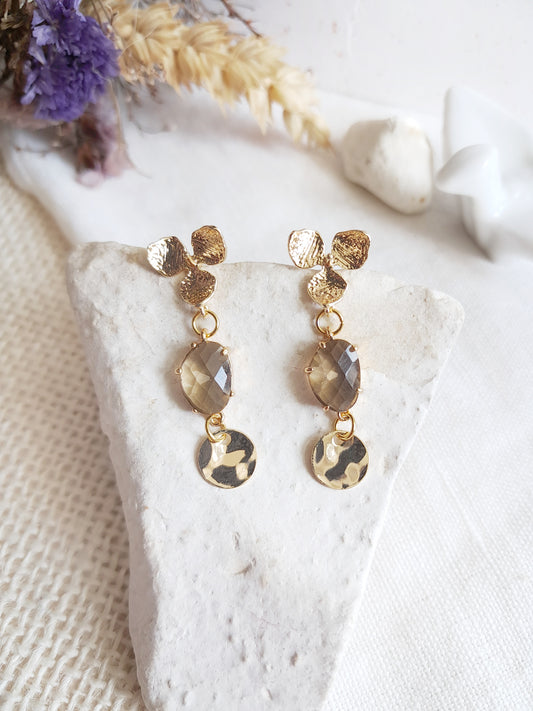 Boucles d'oreilles fleur d'hortensia et gemme marron