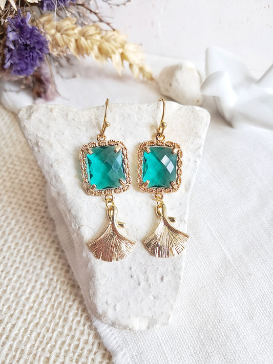 Boucles d'oreilles pendantes feuilles de ginkgo et gemmes vertes