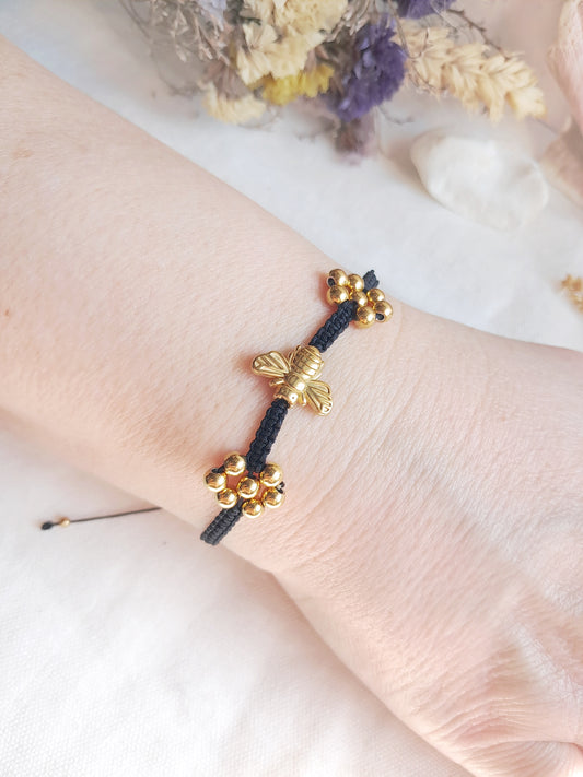 Bracelet shamballa abeille et fleurs en acier inoxydable doré