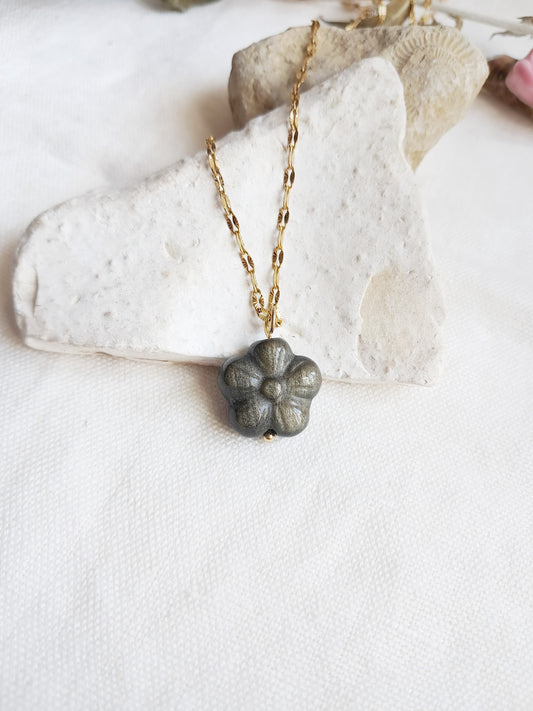 Collier fleur en obsidienne dorée et acier inoxydable doré
