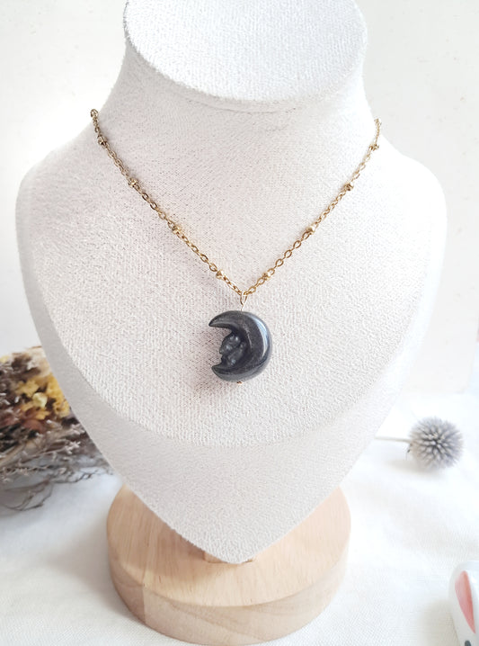 Collier lapin dans la lune en obsidienne argentée et acier inoxydable doré