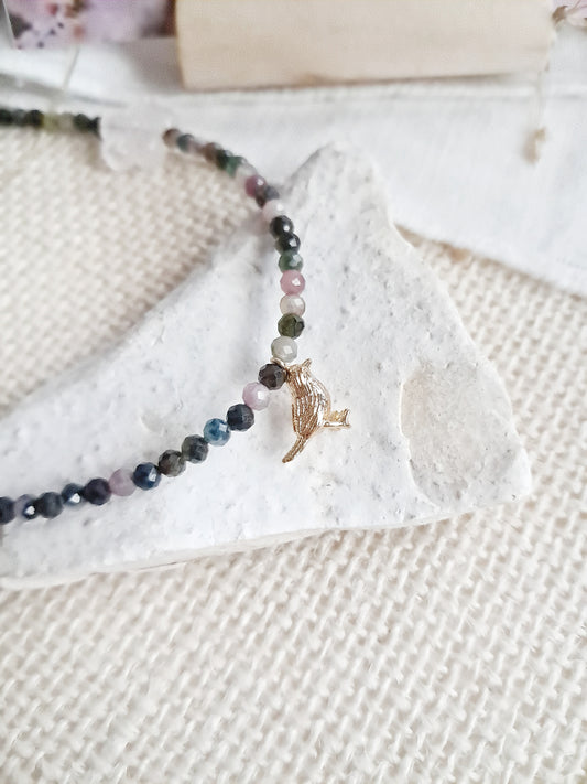 Collier fleurs de cerisier (벚꽃) en tourmaline, quartz rose et laiton 24k