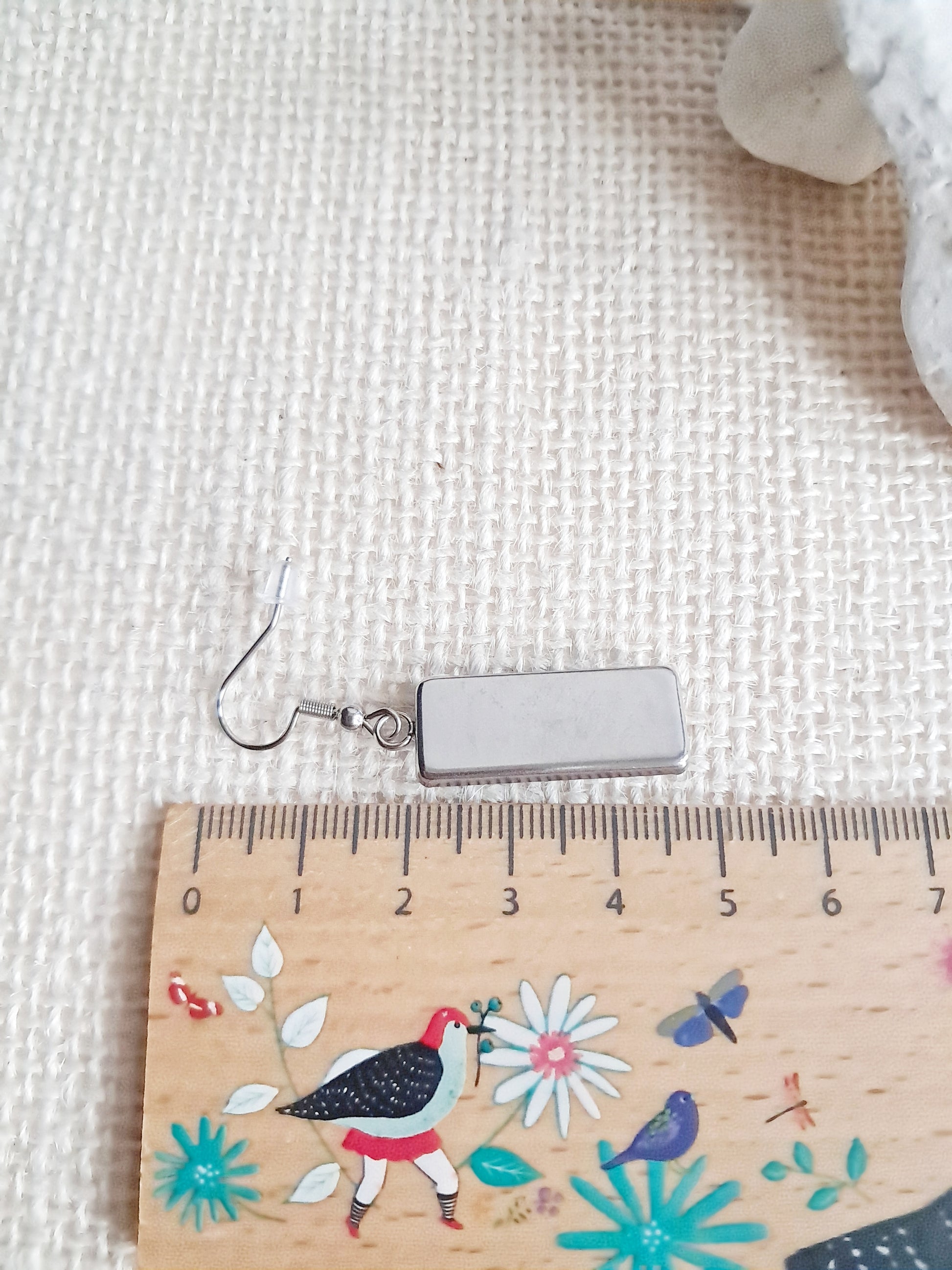 Les boucles d'oreilles mesurent environ 4,8cm de haut et ses crochets sont en acier inoxydable avec bouchons poussoirs en silicone.