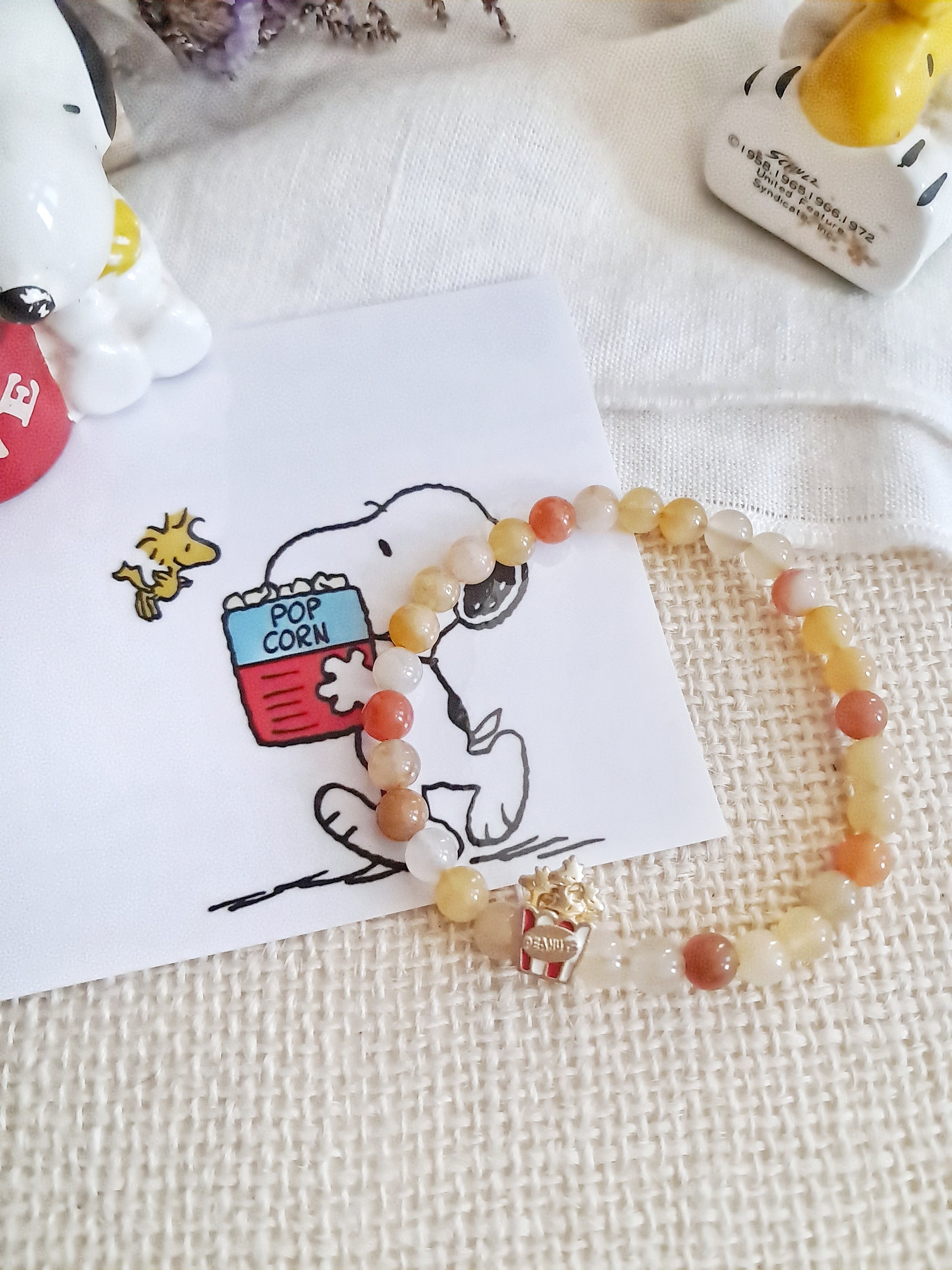 Inspiré de Woodstock l'ami de Snoopy, ce bracelet est fait de perles naturelles en gold silk jade de 6mm avec sa breloque en argent 925.