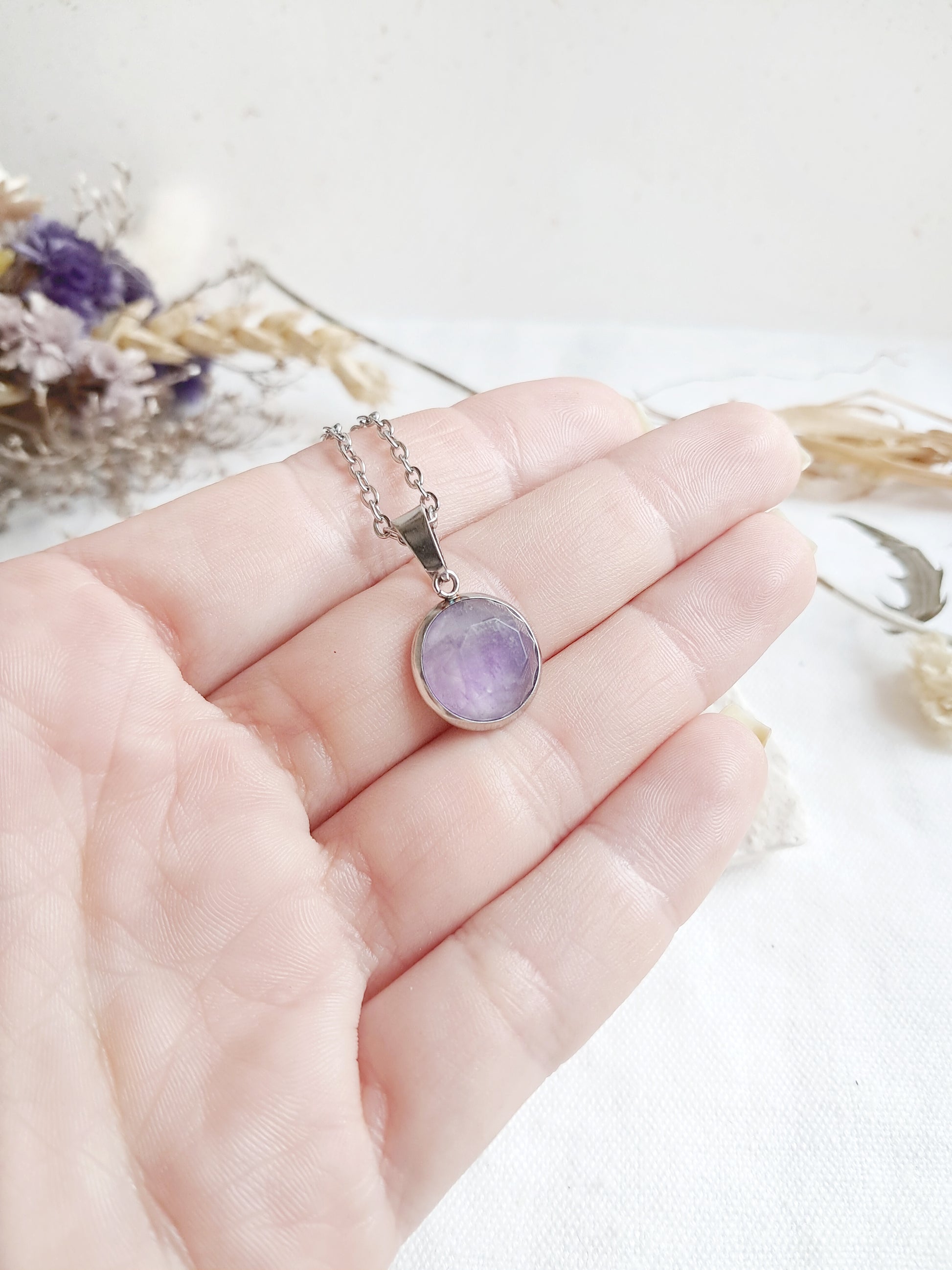 Ce collier cabochon est réalisé dans notre atelier. Il est en améthyste et en acier inoxydable et mesure environ 2,5cm de haut.