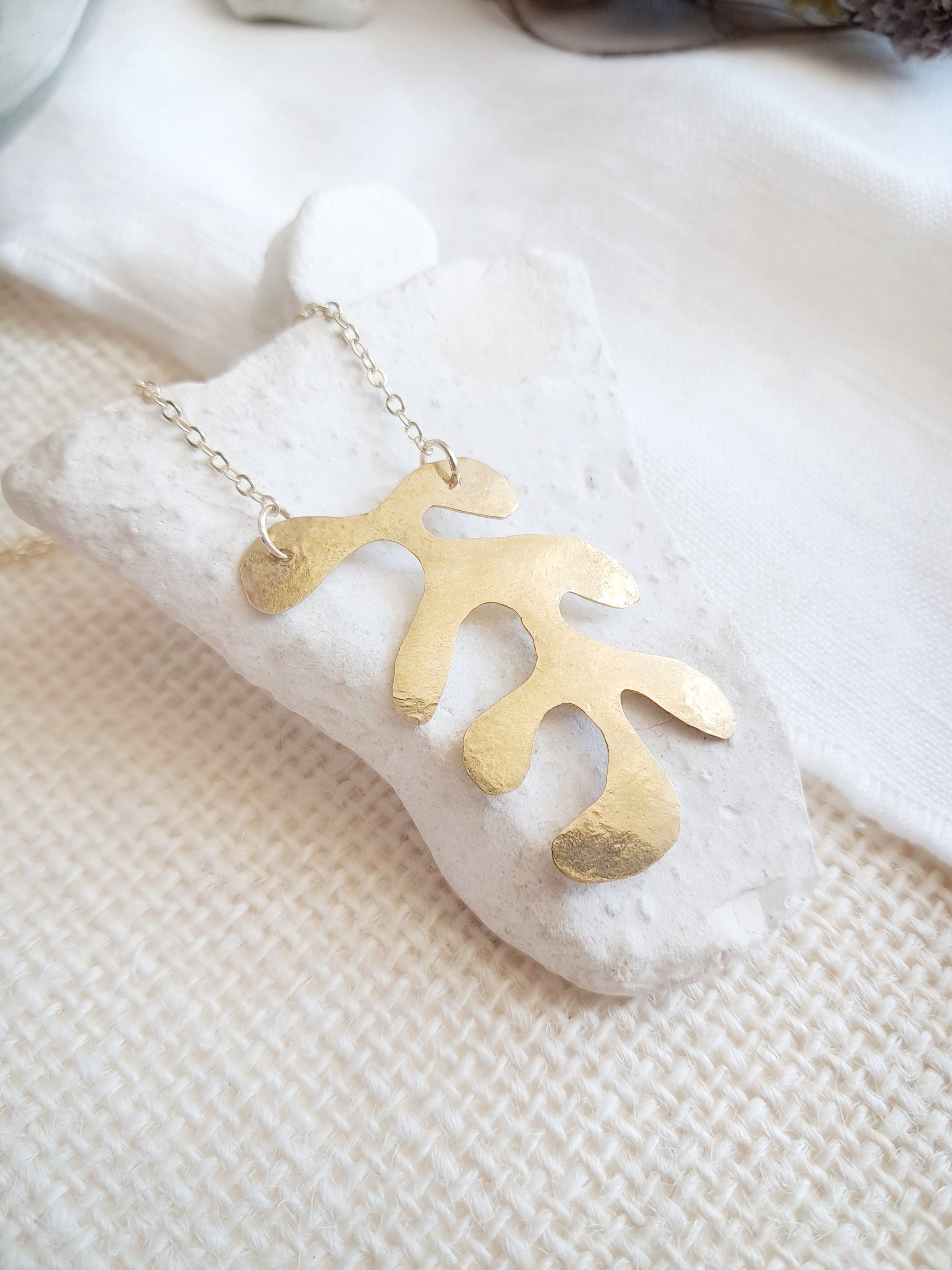 Ce collier feuille inspiré de Matisse est réalisé entièrement dans notre atelier. La chaîne est en laiton plaqué or 18k et la feuille en laiton découpée et texturée à la main.
