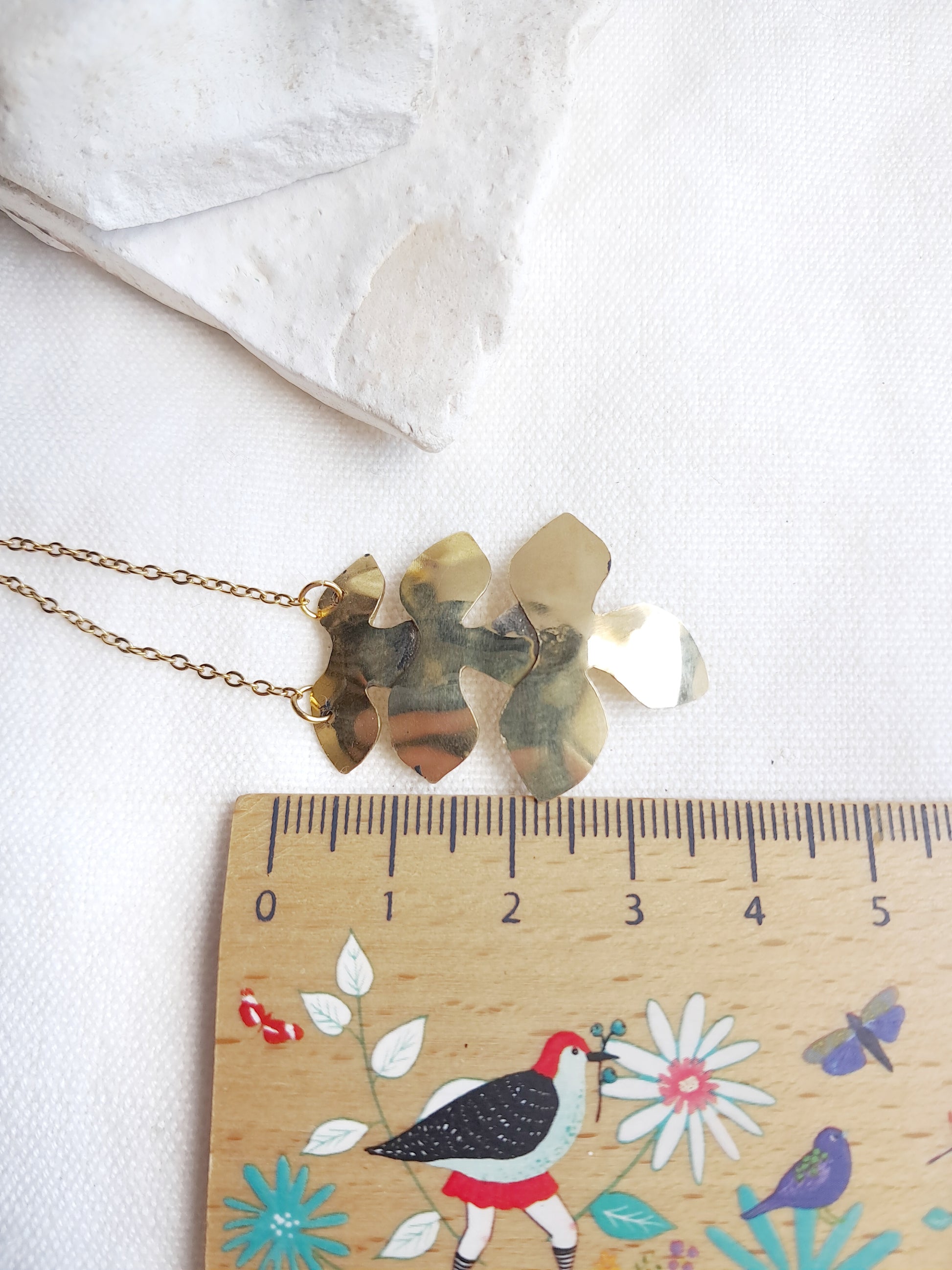 La chaîne est en acier inoxydable doré et les fleurs en laiton découpées et texturées à la main.