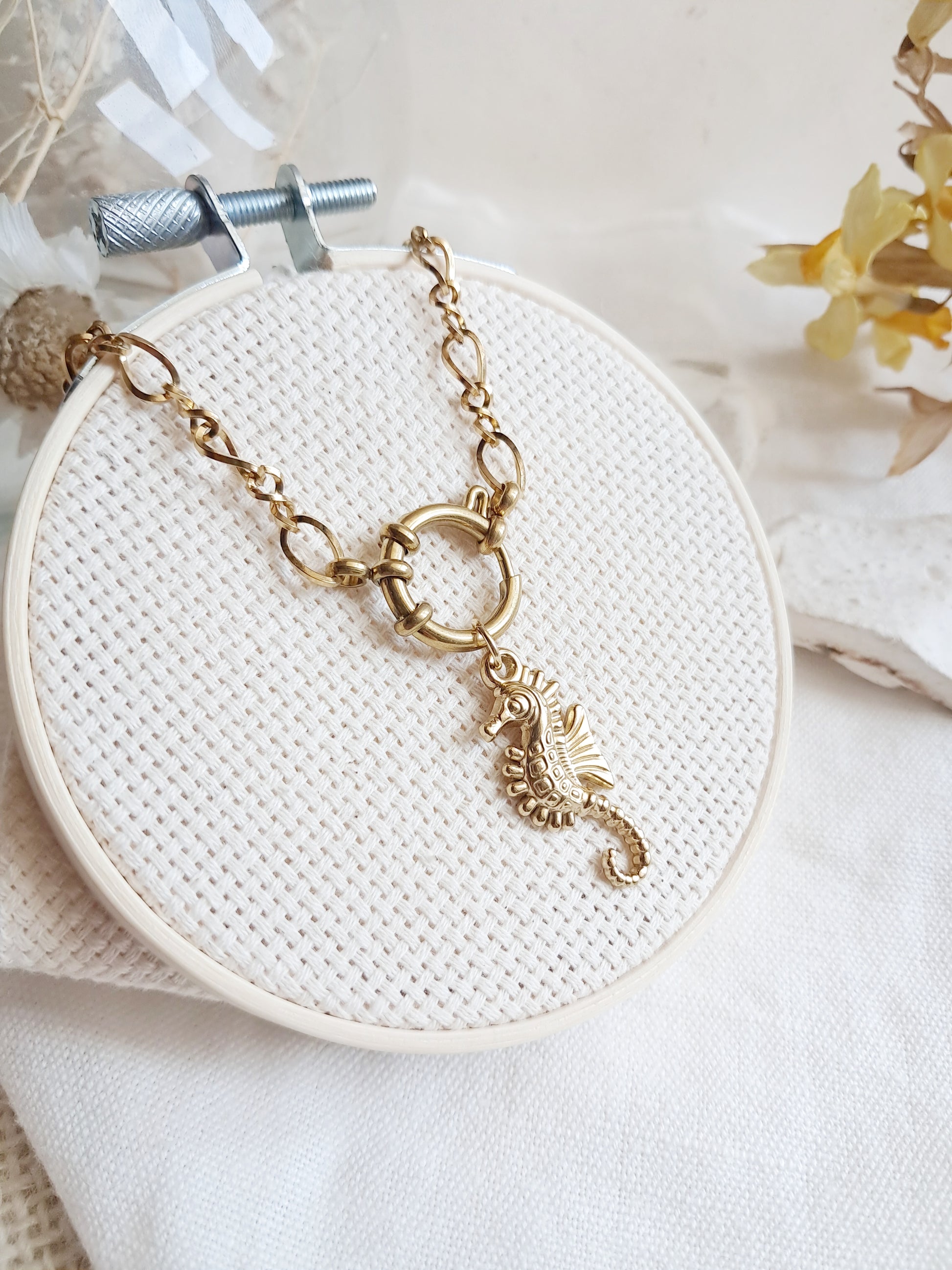 Ce collier marin hippocampe est en acier inoxydable doré.