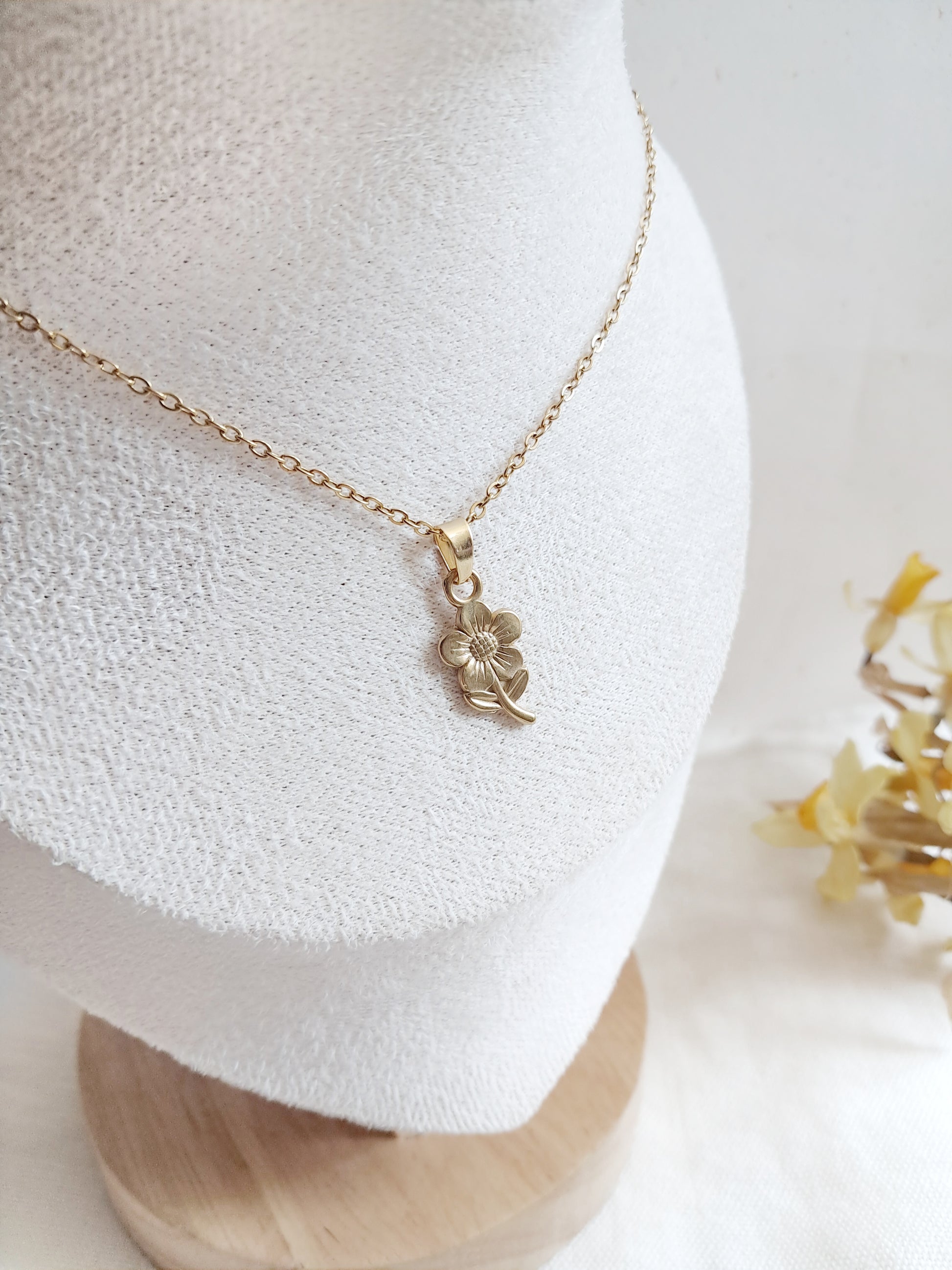 Ce pendentif fleur est en acier inoxydable doré et mesure 2,4cm de haut. Il est vendu avec sa chaîne en acier inoxydable d'environ 45cm.