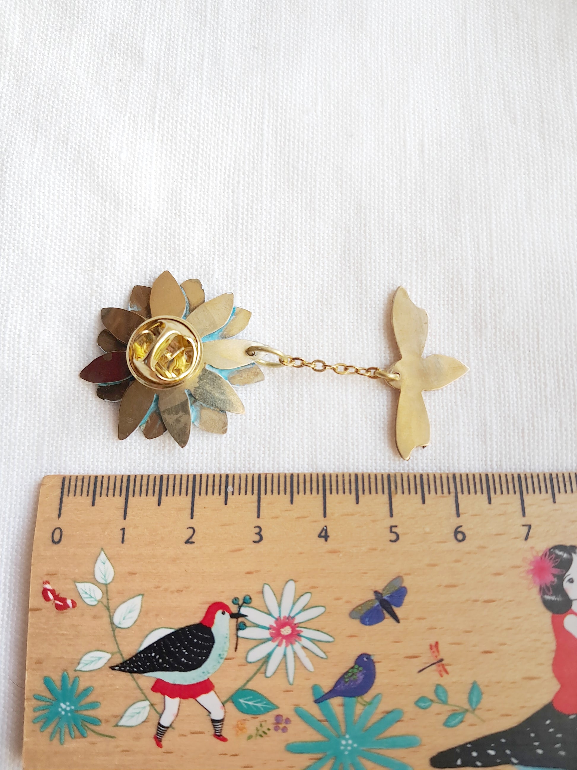 Ce pin's marguerite et abeille est réalisée entièrement à la main. Il a été découpé à la scie dans une plaque de laiton et colorisé. La chaîne utilisée est en acier inoxydable doré.