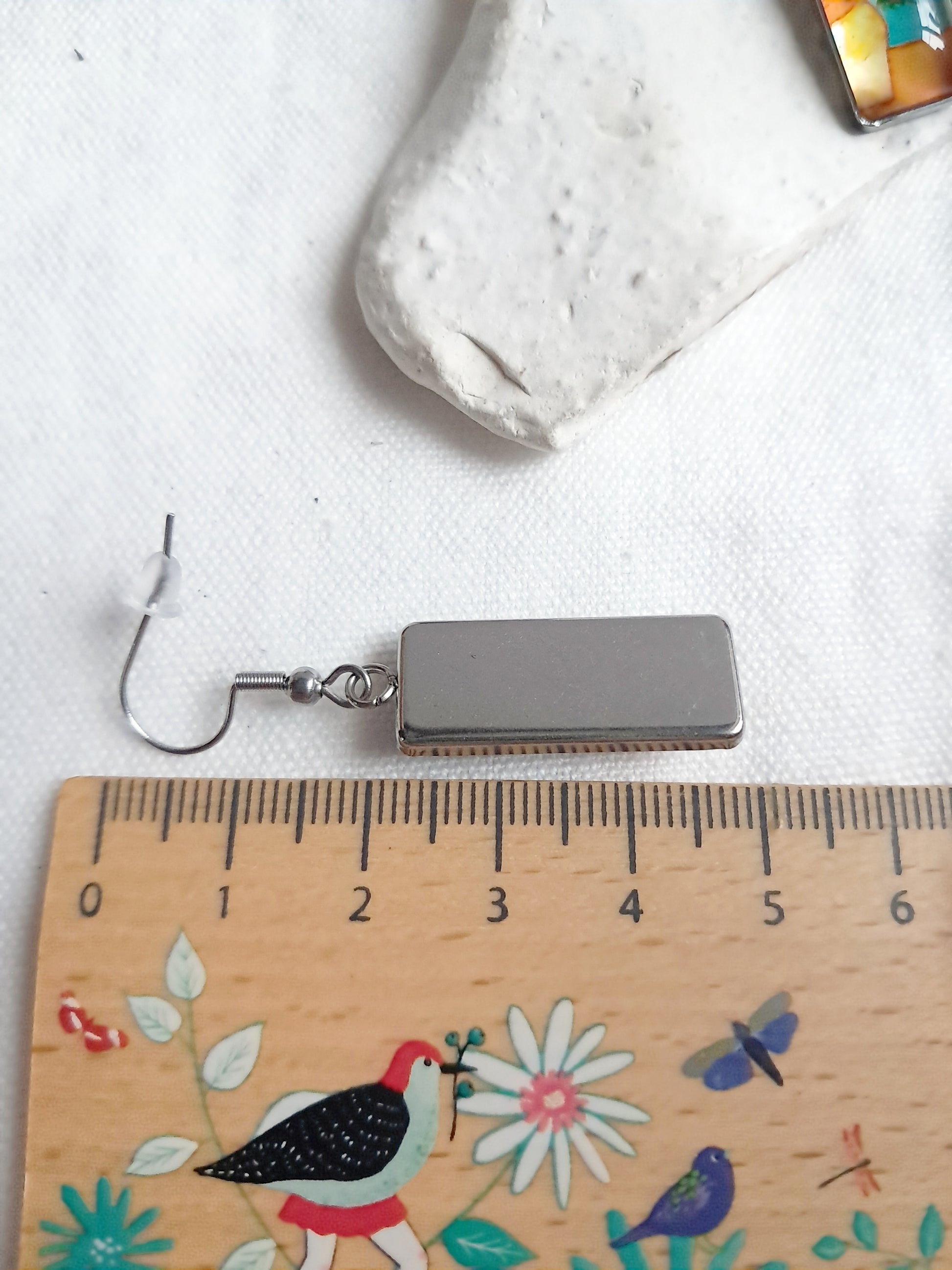 Les boucles d'oreilles mesurent environ 4,8cm de haut et ses crochets sont en acier inoxydable avec bouchons poussoirs en silicone.