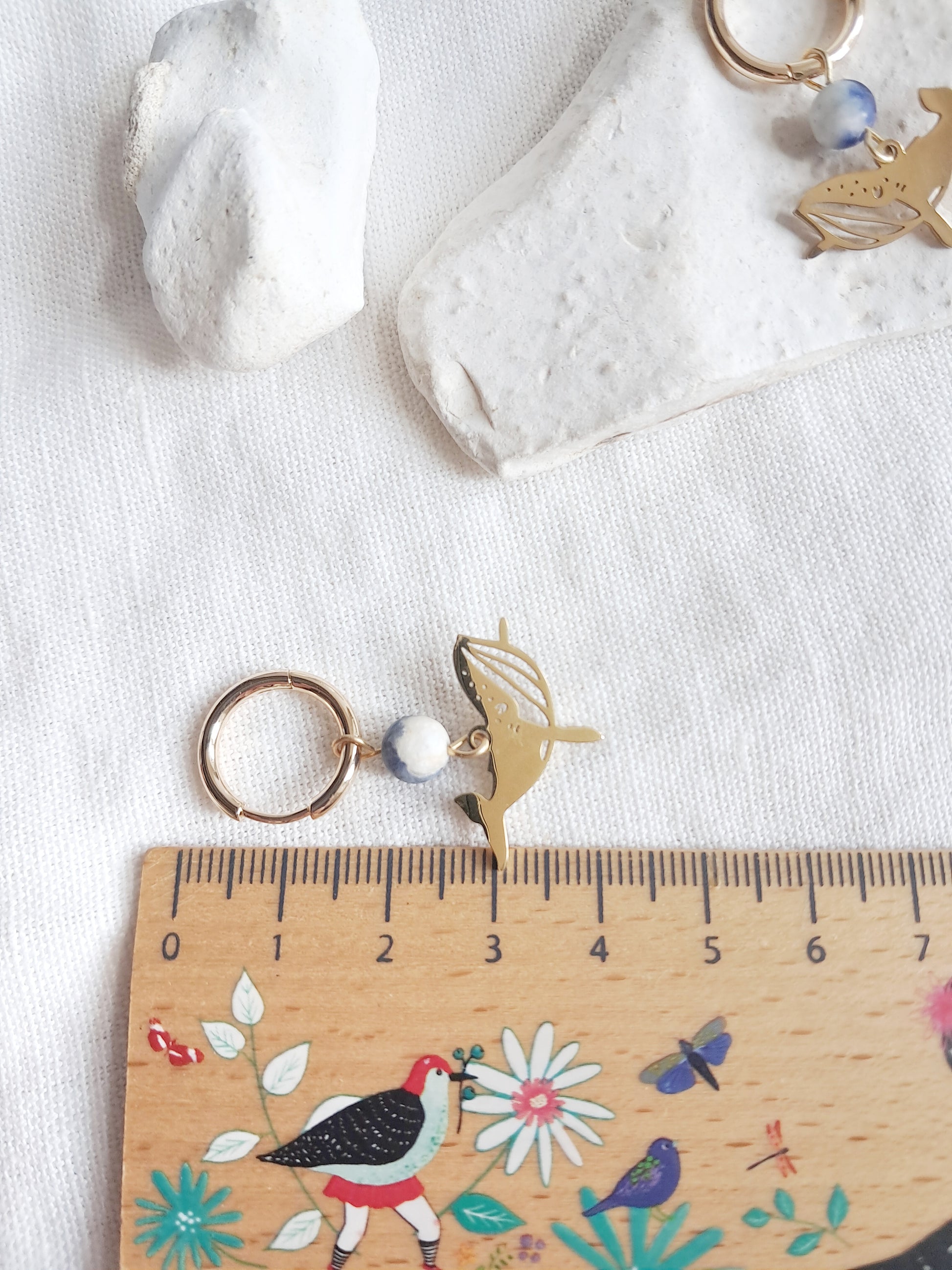Les attaches sont en laiton plaqué or 18k, montées avec des baleines en acier inoxydable. Les perles bleues et blanches sont en sodalite.
