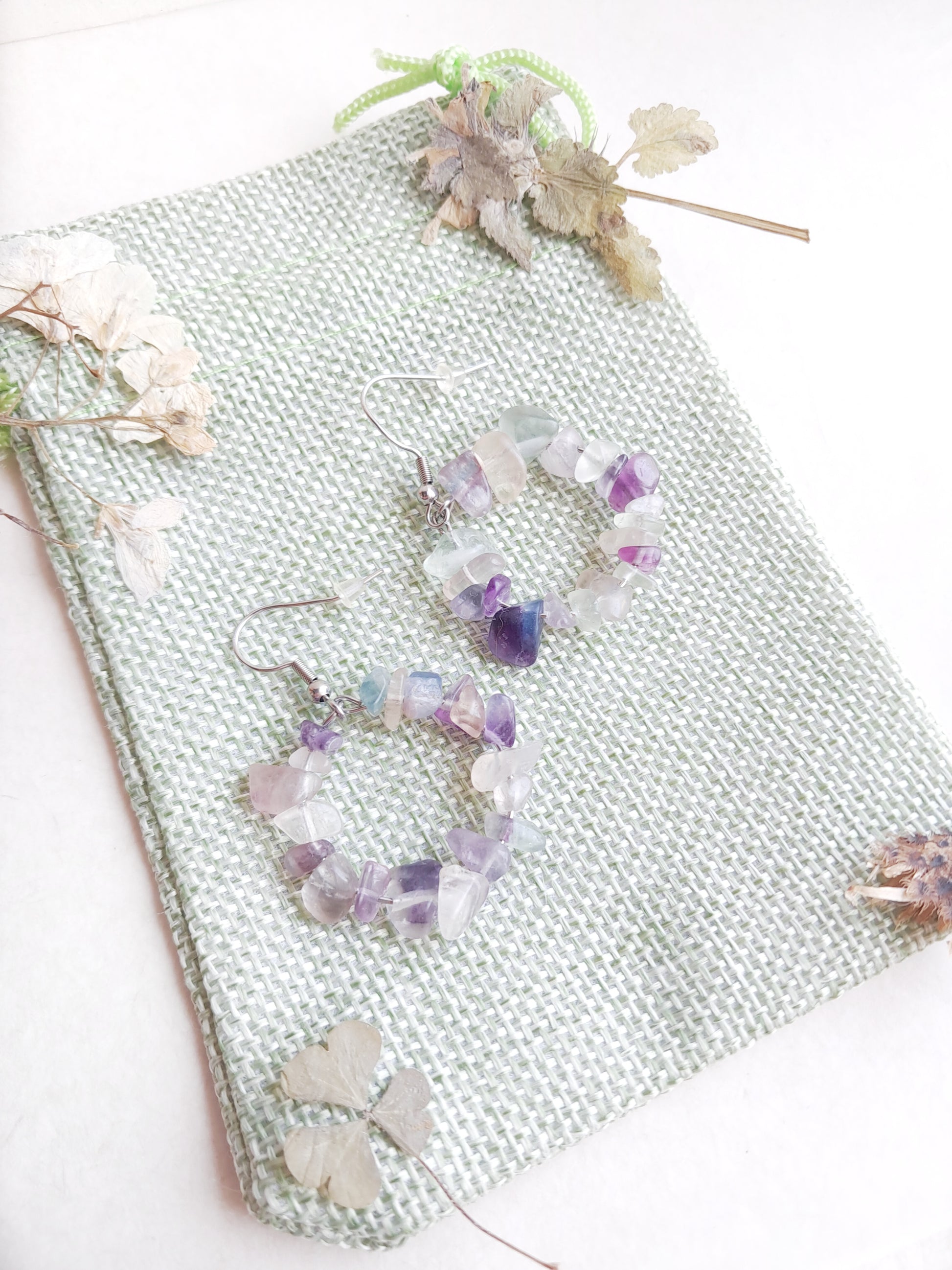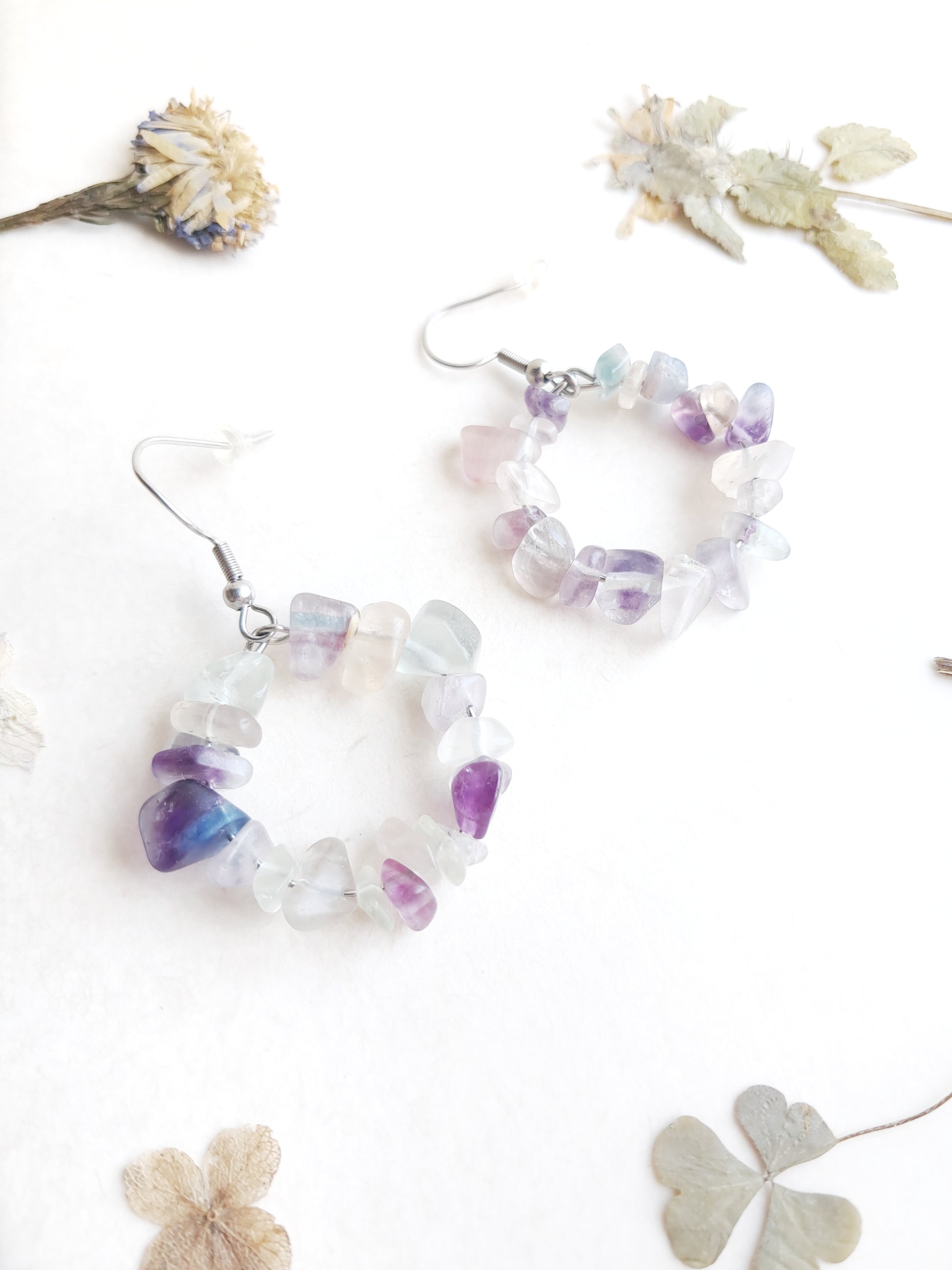 Ces boucles d'oreilles créoles sont faites de chips en fluorite.