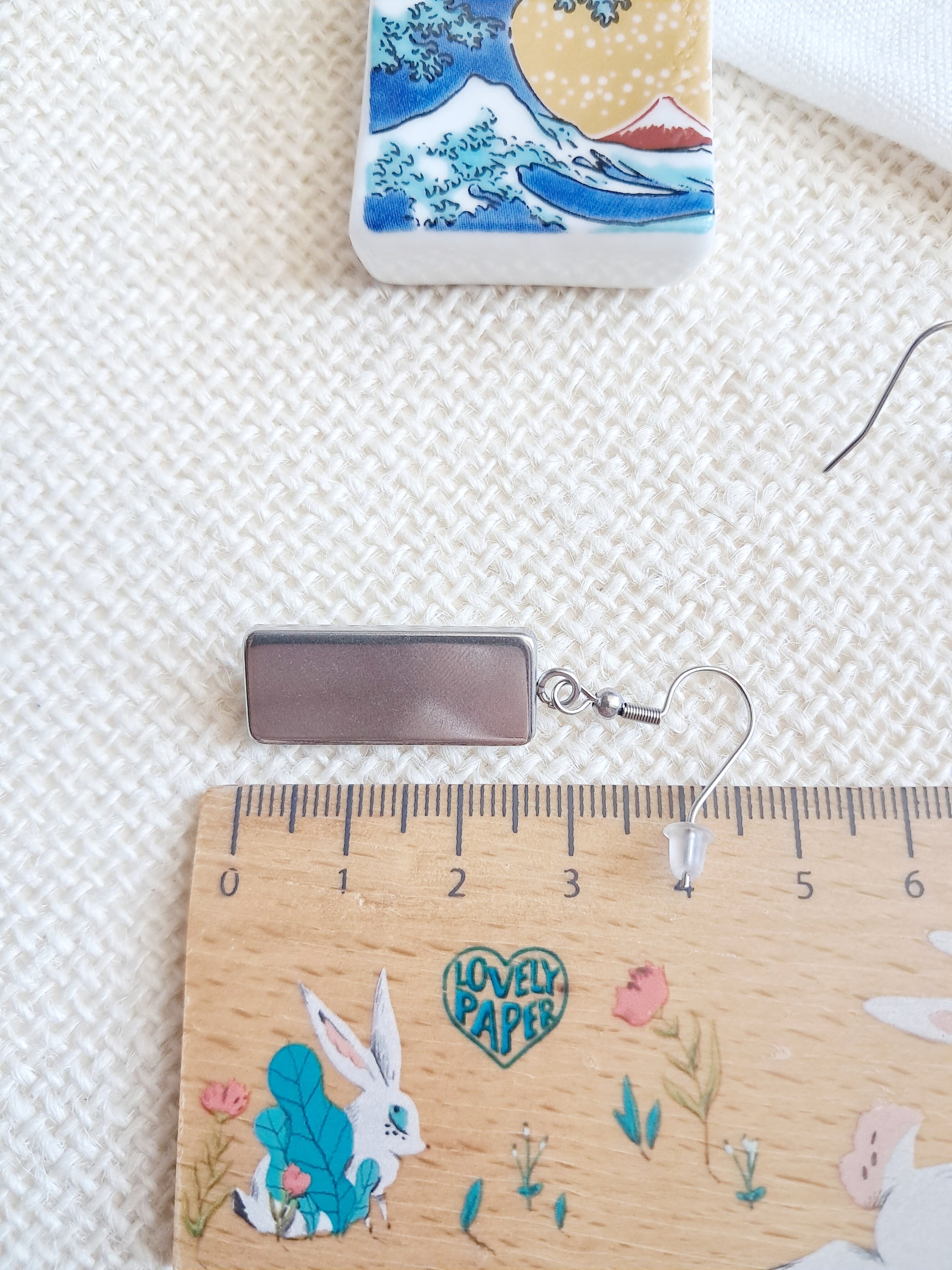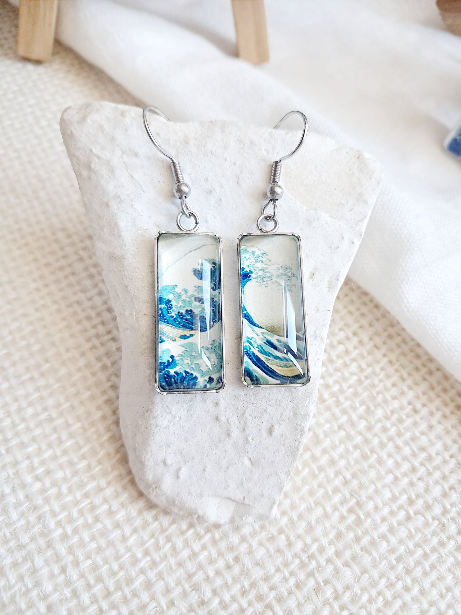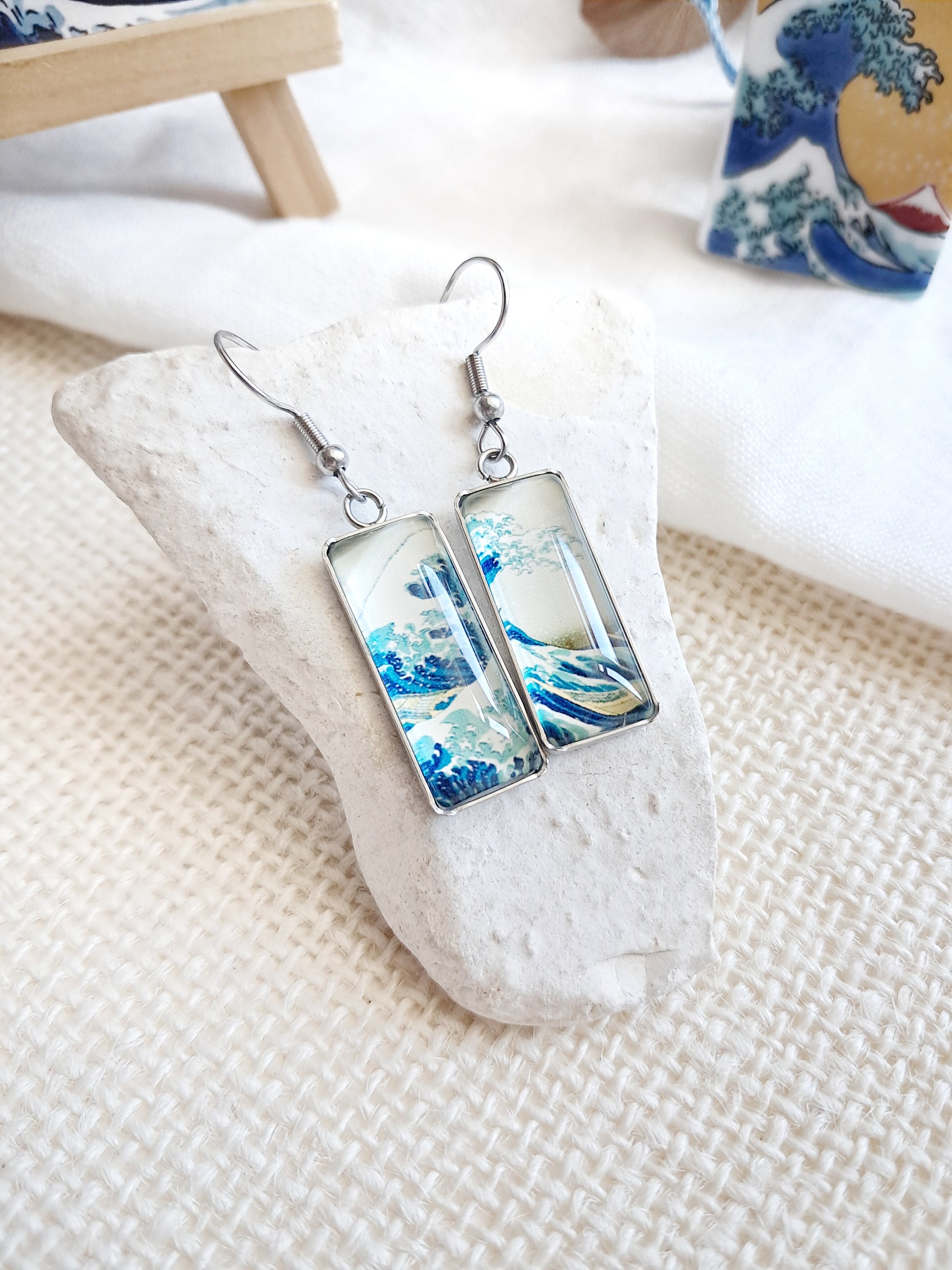Ces boucles d'oreilles pendantes sont en verre et acier inoxydable. Elles représentent La grande vague de Kanagawa par Hokusai.
