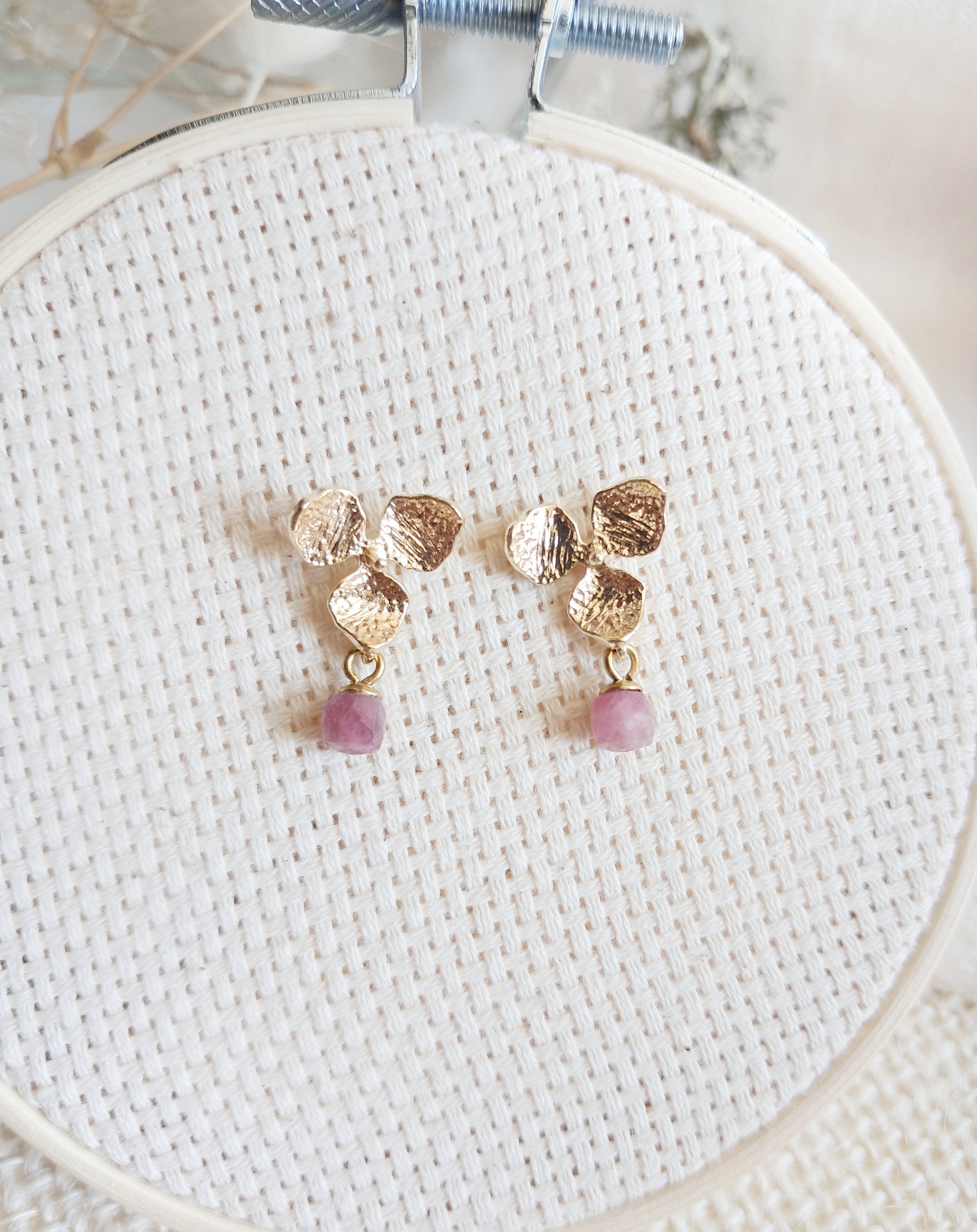 Boucles d'oreilles fleurs d'hortensia et tourmaline rose