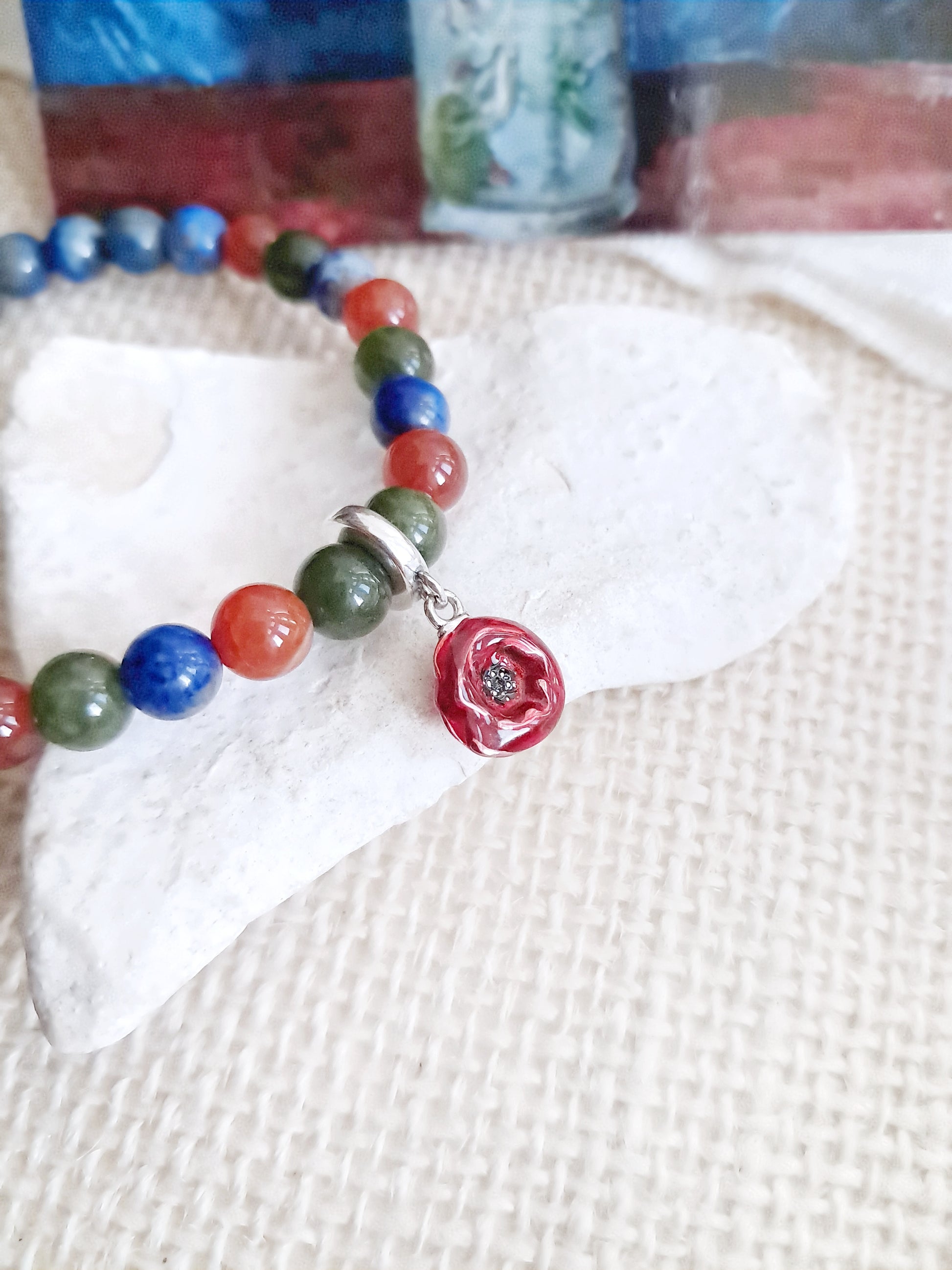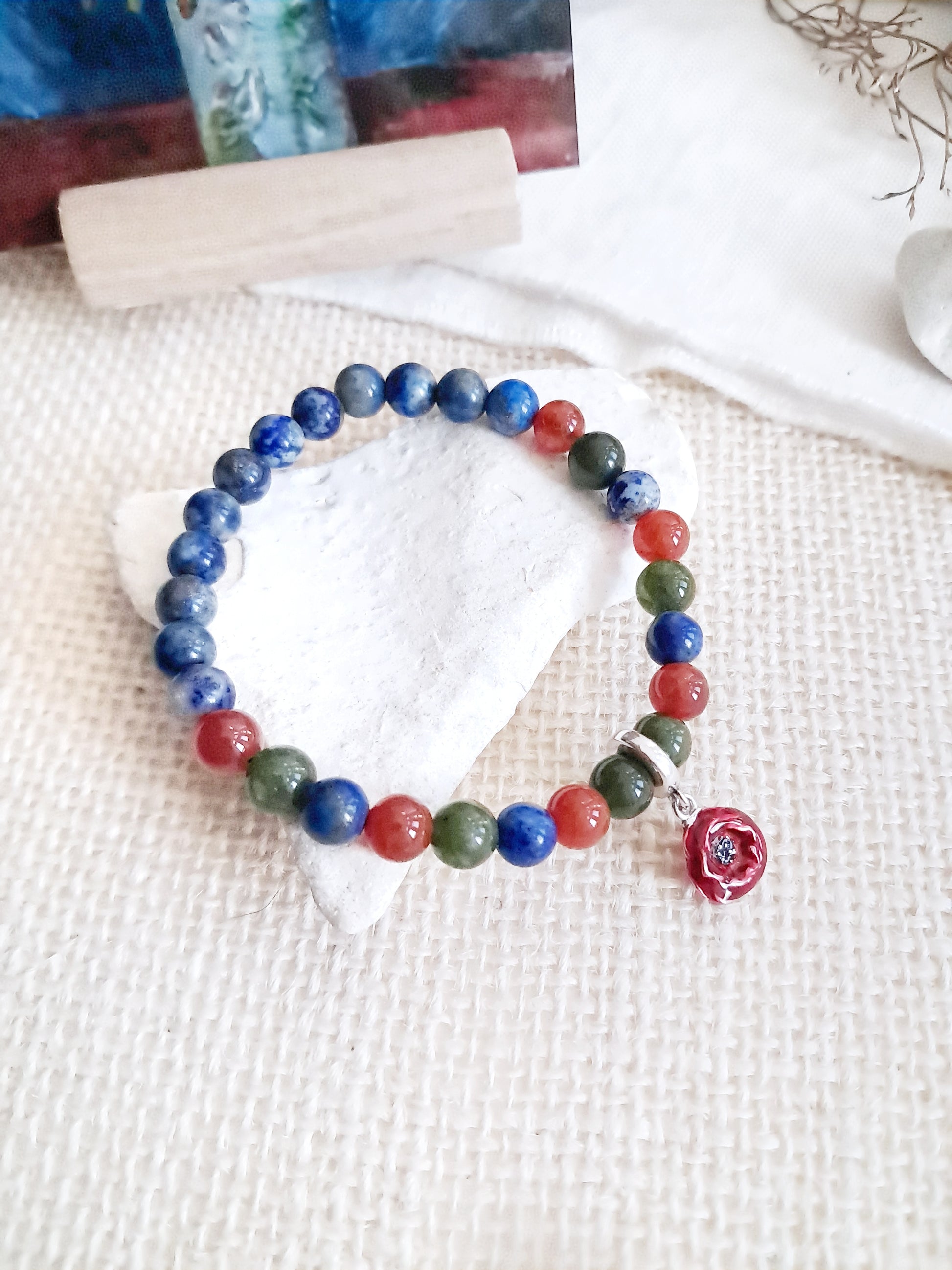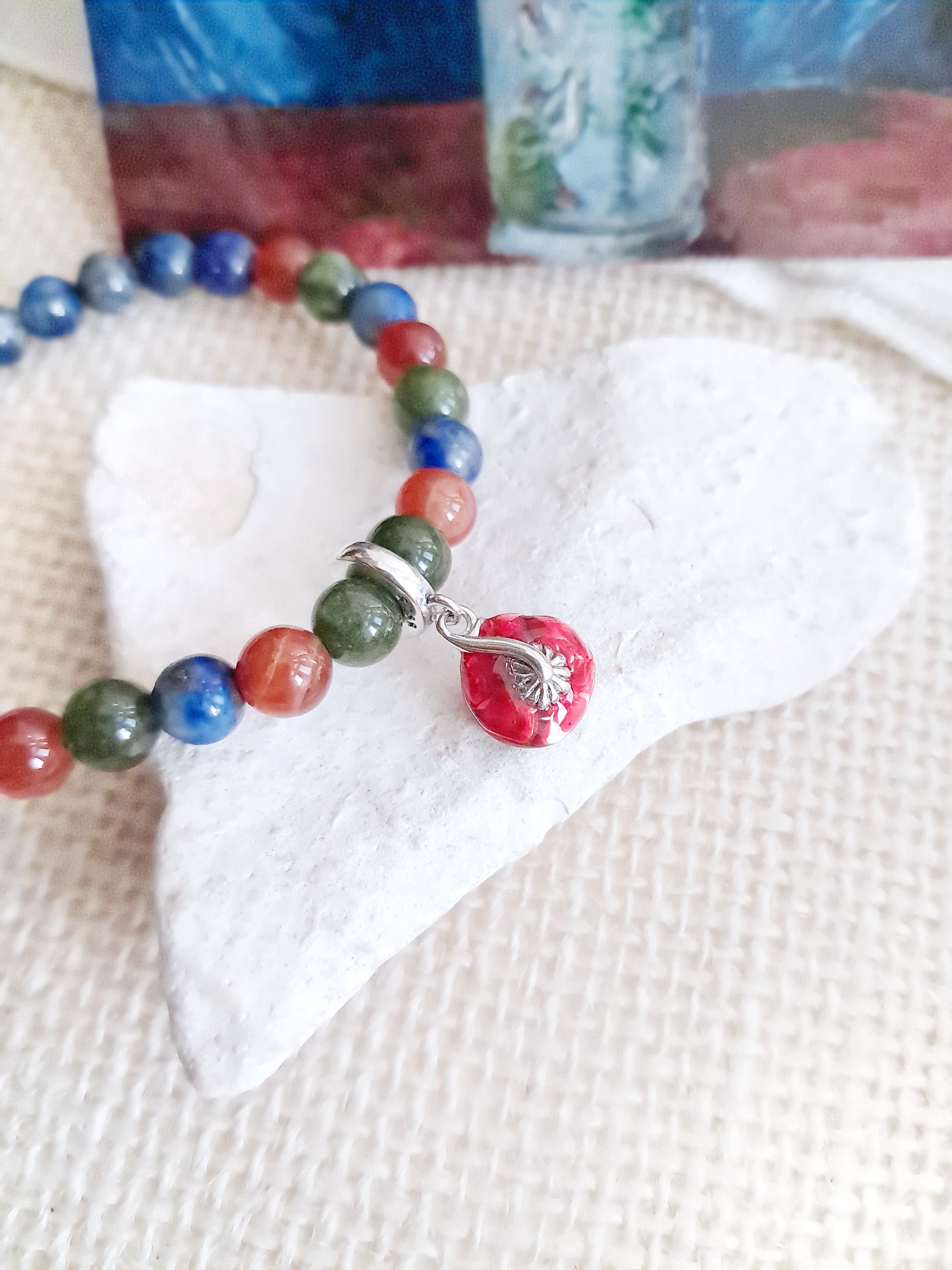 Ce bracelet inspiré du "bouquet de coquelicots" de Vincent Van Gogh est une création faite main réalisée avec de perles en lapis-lazuli, jade et agate pop-corn de 6mm de diamètre, avec sa breloque coquelicot en argent 925.