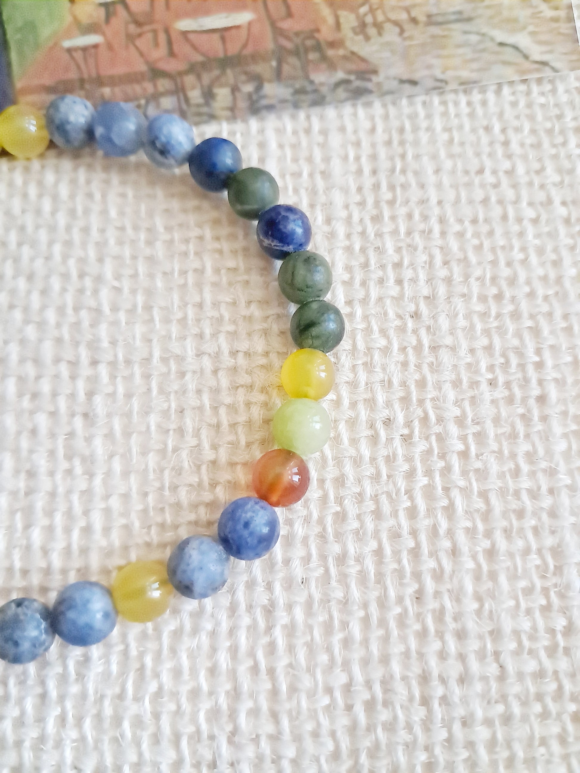 Ce bracelet est une création fait main, réalisé en perles naturelles en dumortiérite, jade et agate de 6mm de diamètre, avec sa breloque pendentif en argent 925.