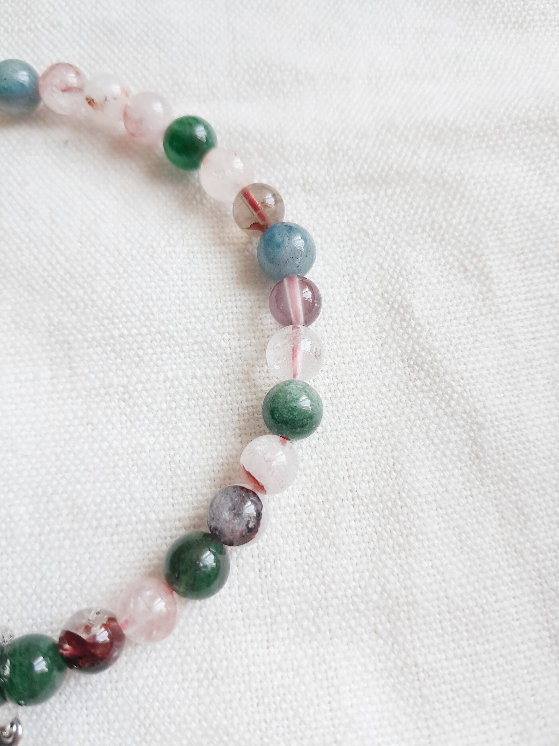 Pour célébrer le Hanbok (vêtement traditionnel coréen), nous avons créé ce bracelet en pierres naturelles en lépidolite verte et quartz hématoïde, avec sa breloque en argent 925.