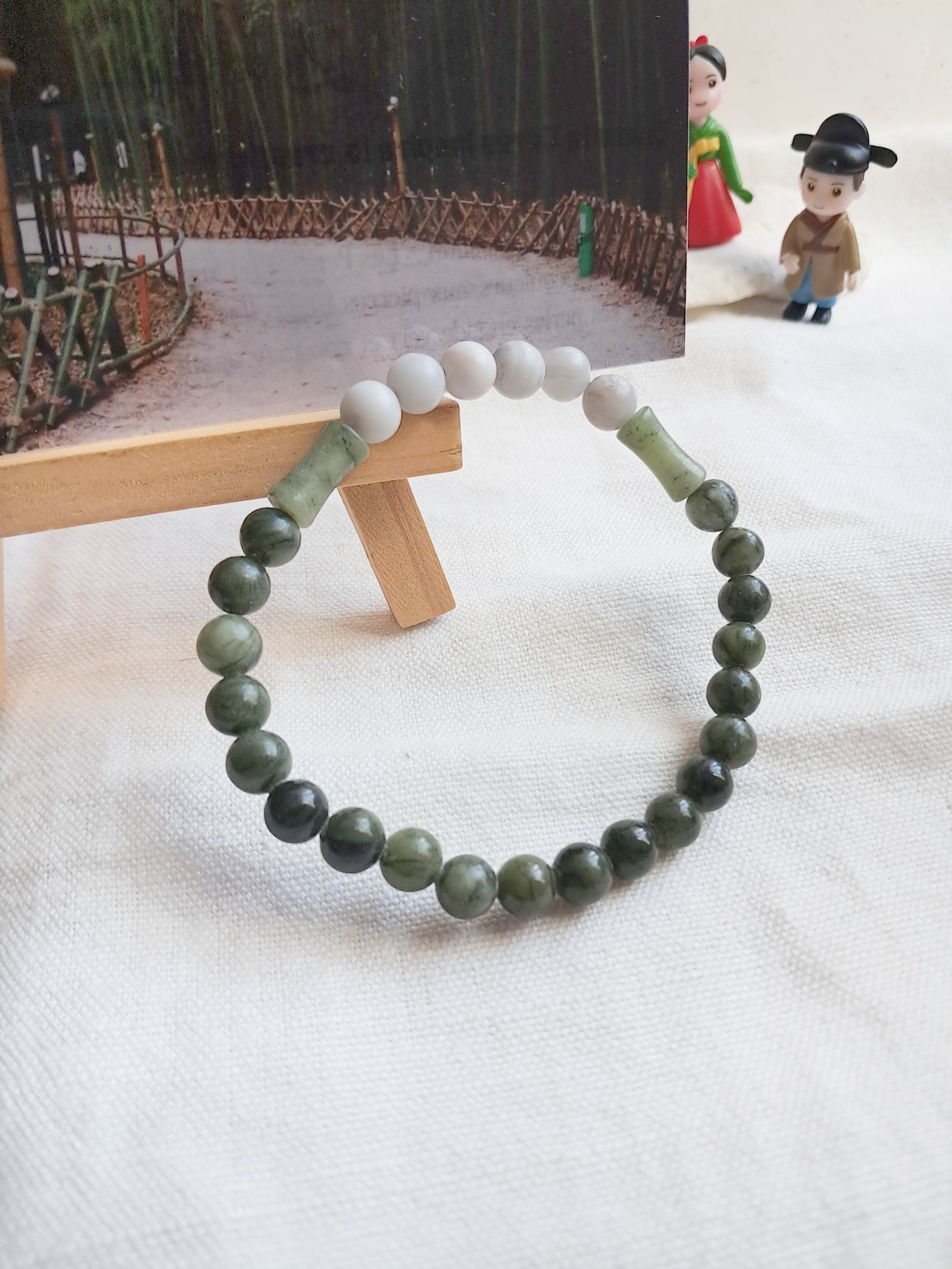 Inspiré du Bambou (대나무), plante très rependu en Corée, ce bracelet est fait de perles naturelles de 6mm en jade vert et en crazy agate.