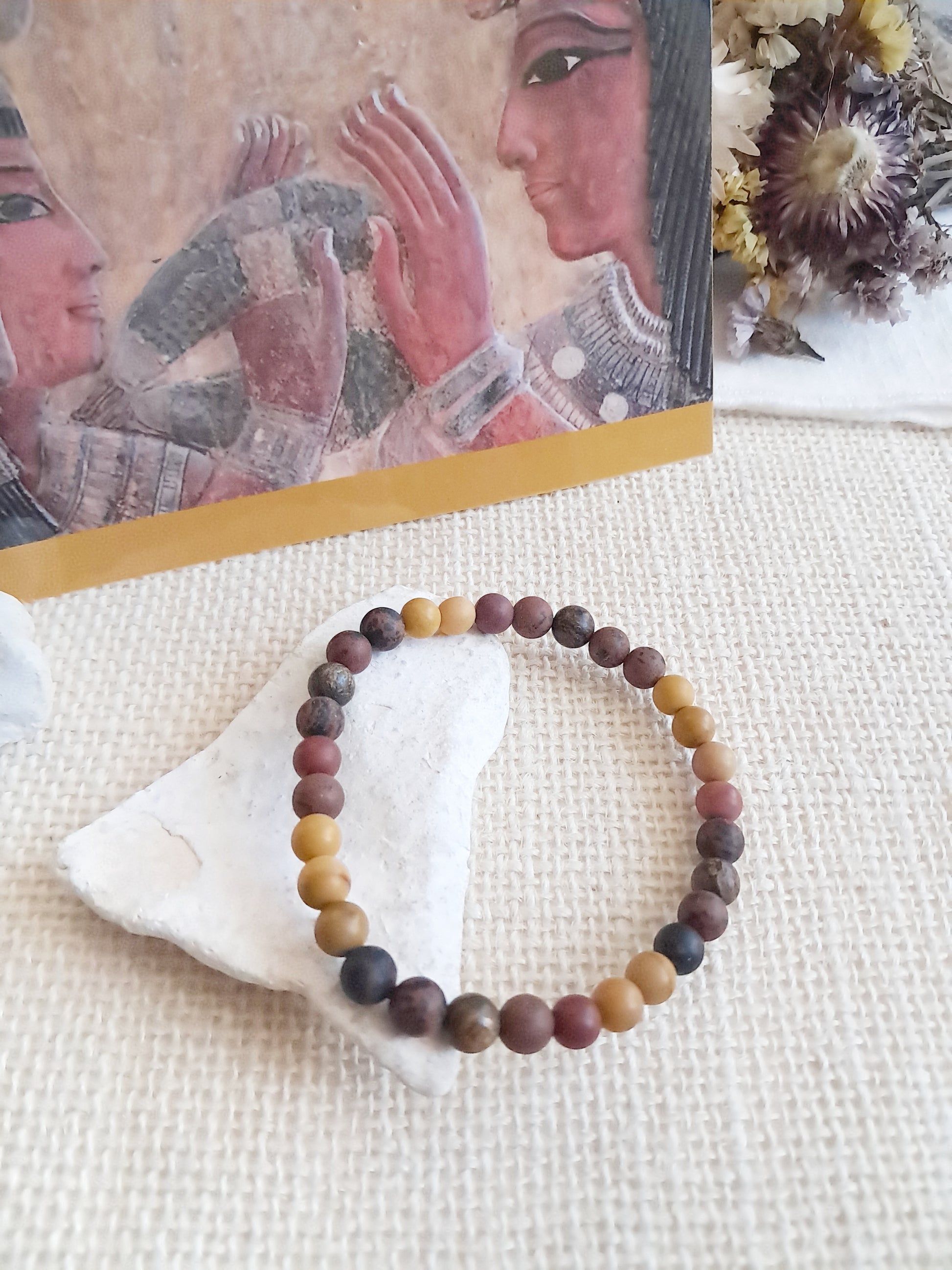 Ce bracelet est une création faite main réalisée avec des perles naturelles en obsidienne acajou, mookaite et bronzite mattes de 6mm de diamètre.