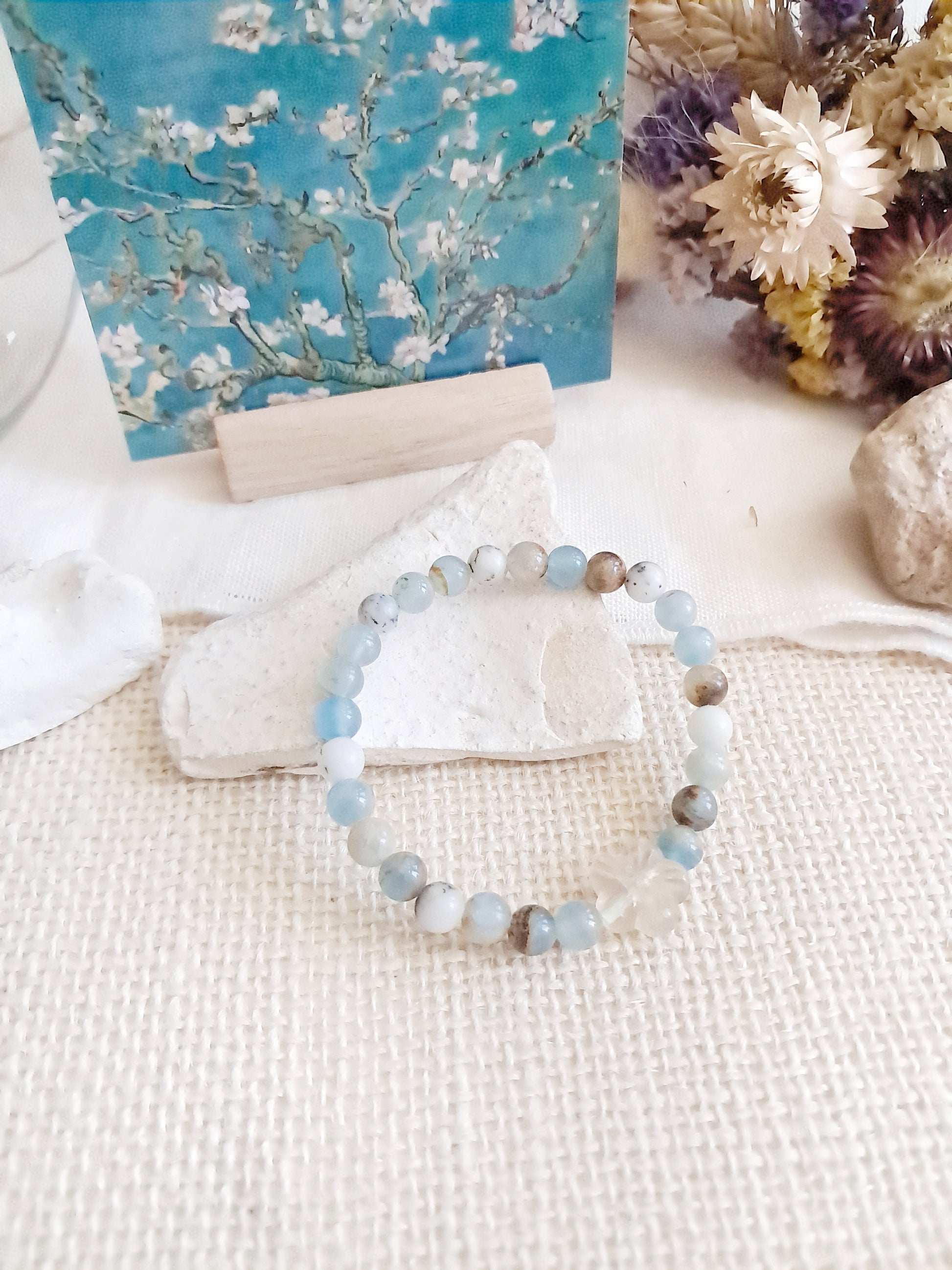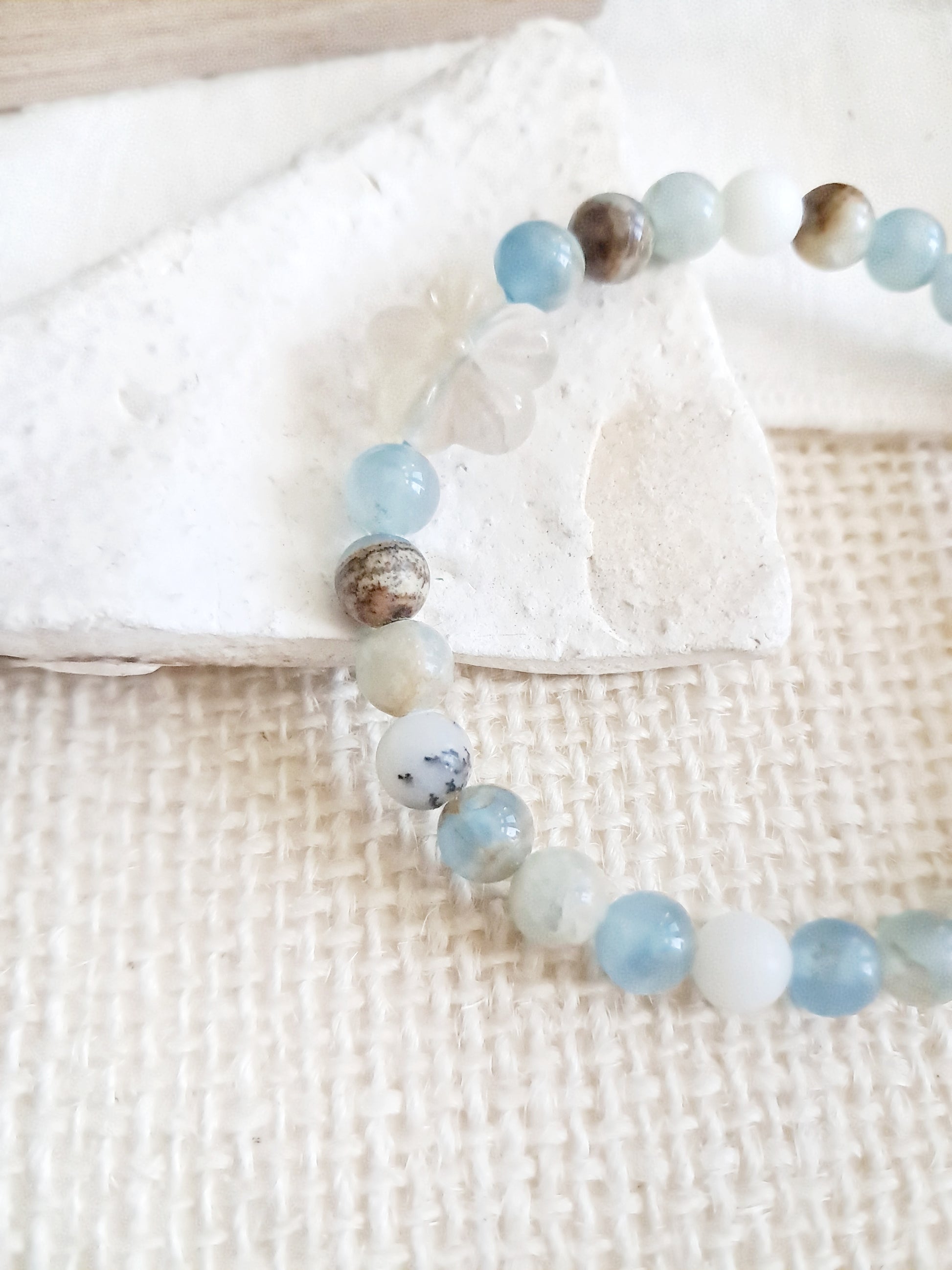 Ce bracelet est une création fait main, réalisé en perles naturelles en calcite, fluorite et opale blanche de 6mm de diamètre.