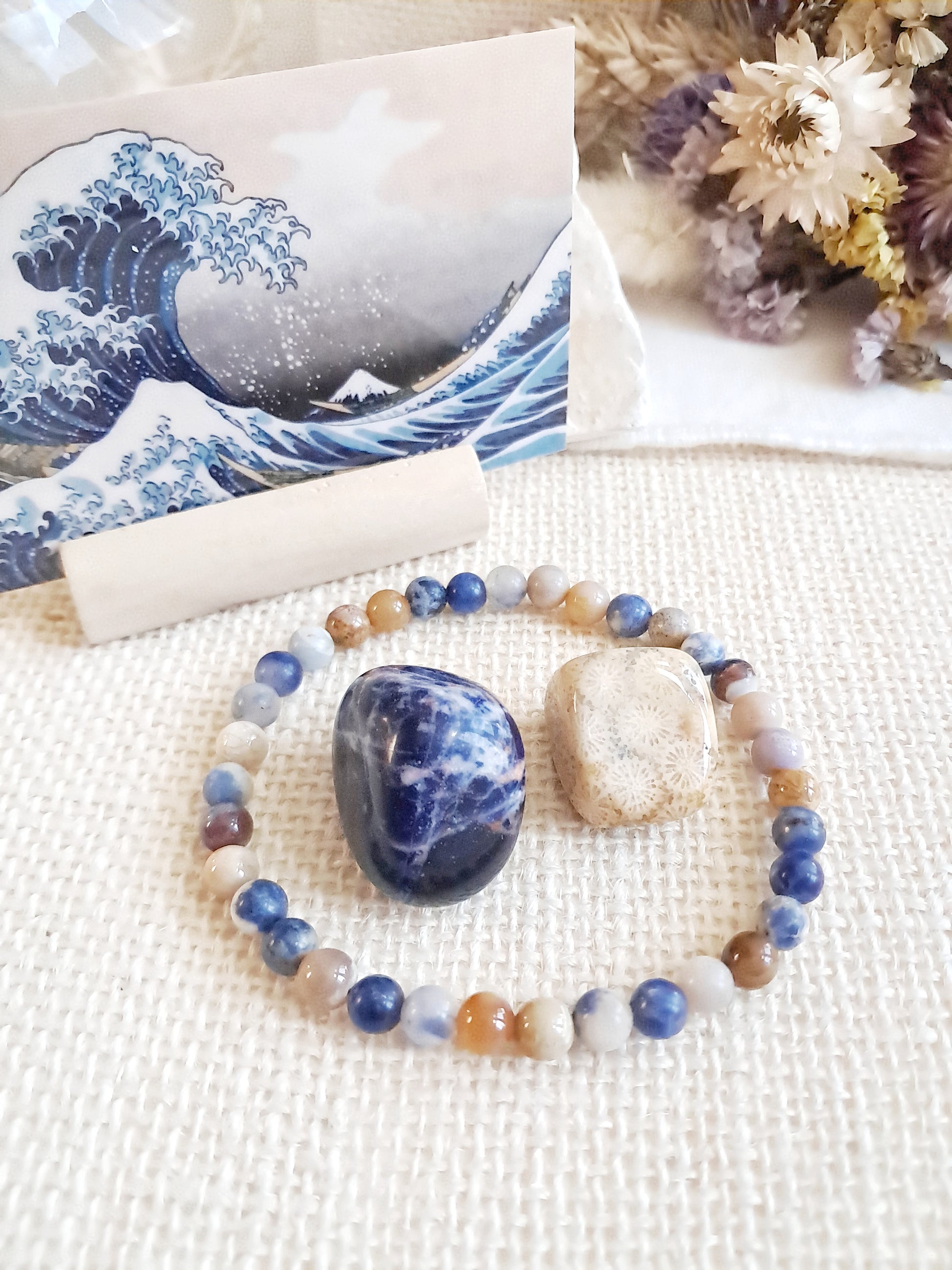 Ce bracelet est une création fait main réalisée avec des perles naturelles en chrysanthème et sodalite brillantes de 6mm de diamètre.