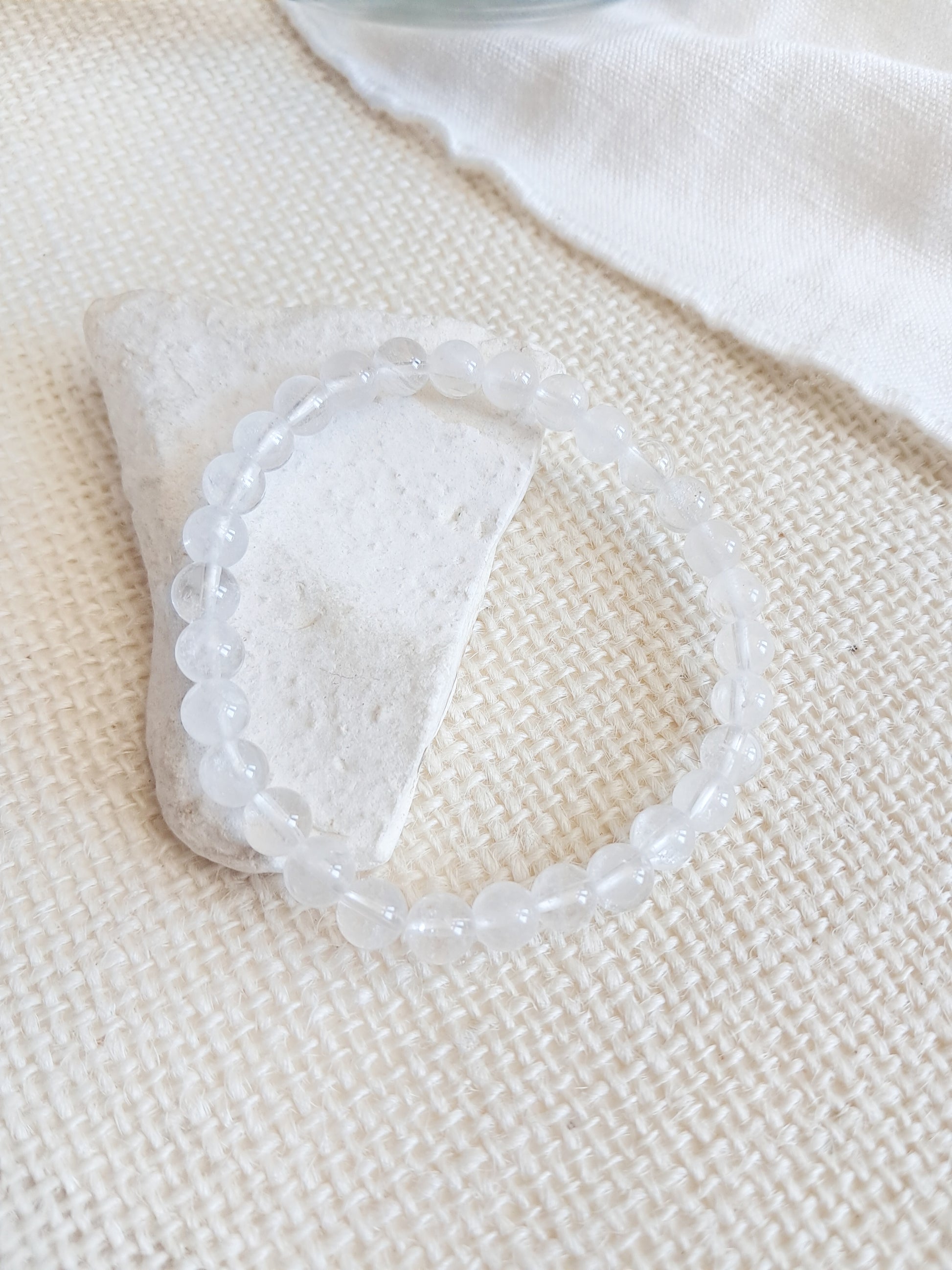 Ce bracelet "Peur" est une création fait main réalisée avec des perles naturelles en cristal de roche de 6mm de diamètre.