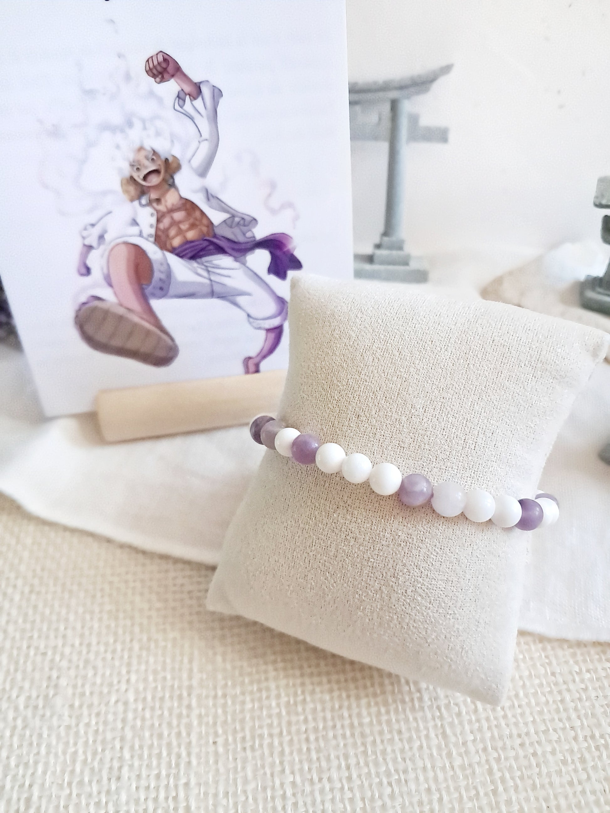 Le Gear 5 est la technique de combat de Monkey D. Luffy qui apparaît pendant la guerre d'Onigashima. Il nous a inspiré ce bracelet en lépidolite et coquille de Tridacna de 6mm.