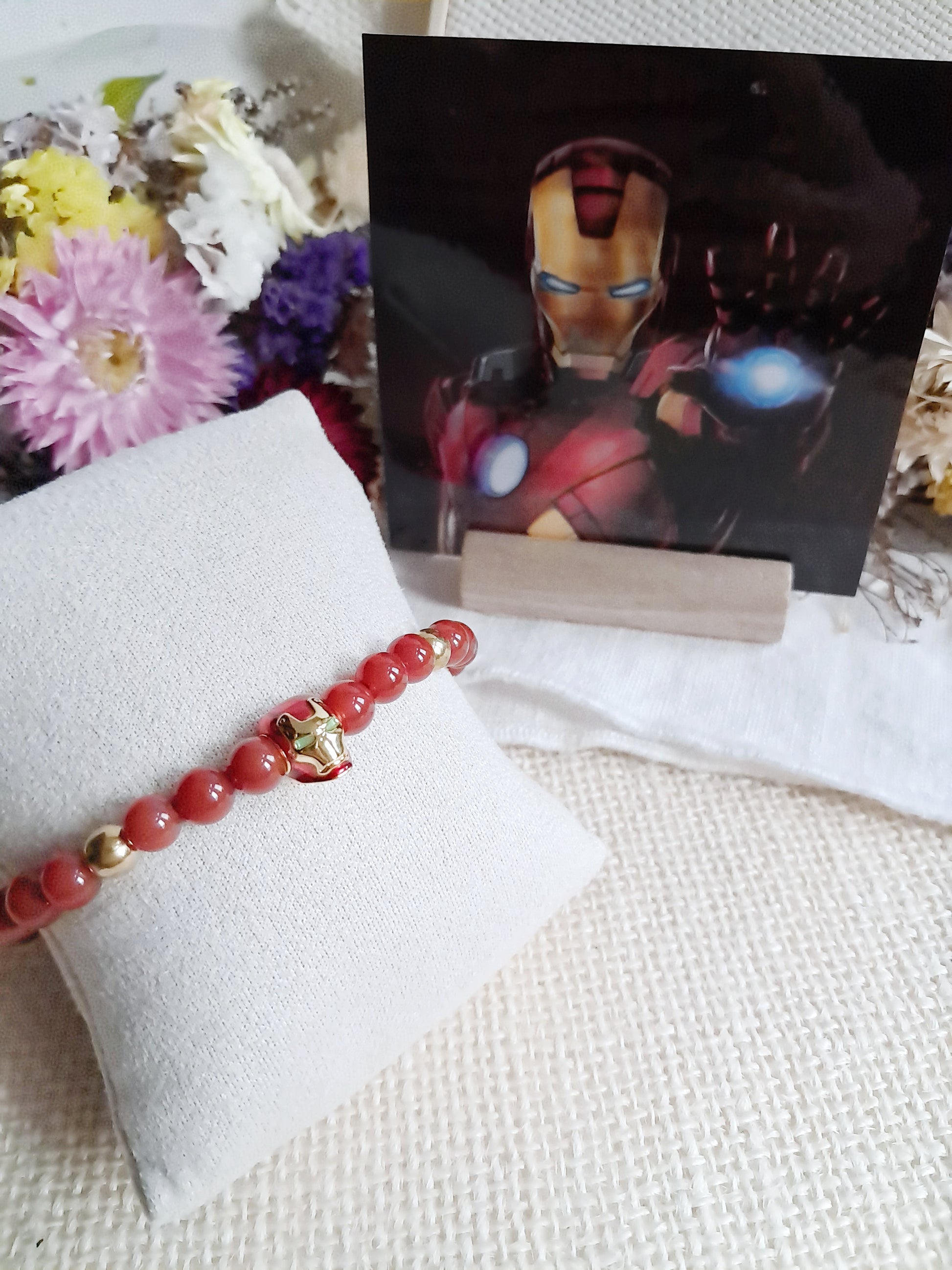 Inspiré d'Iron Man, ce bracelet est fait de perles naturelles en agate rouge et laiton de 6mm avec sa breloque en argent 925.