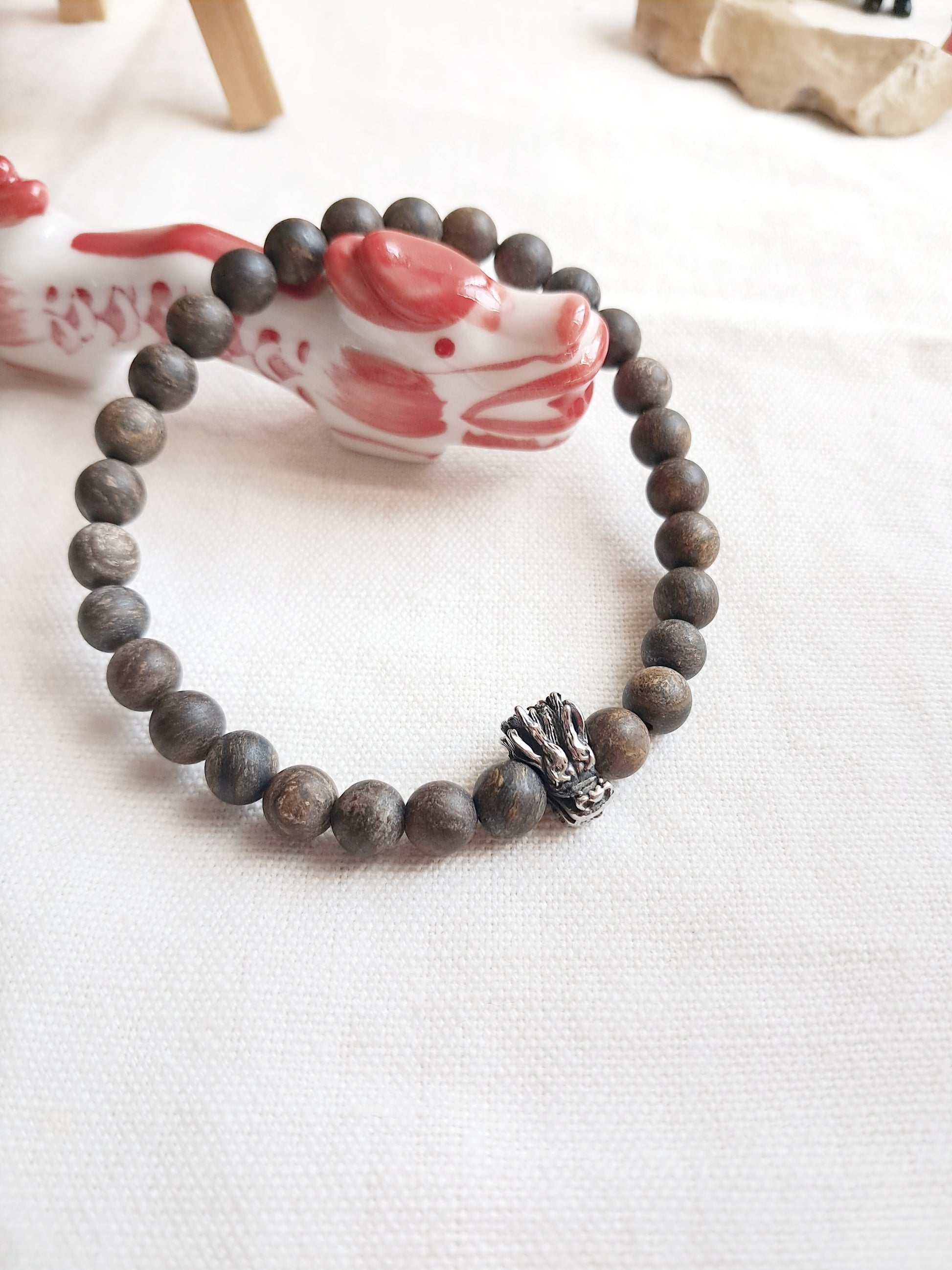 Nous avons créé ce bracelet en pierres naturelles en bronzite de 6mm, avec une perle dragon en acier inoxydable, en nous inspirant de la cloche en bronze de Cheonheungsa.