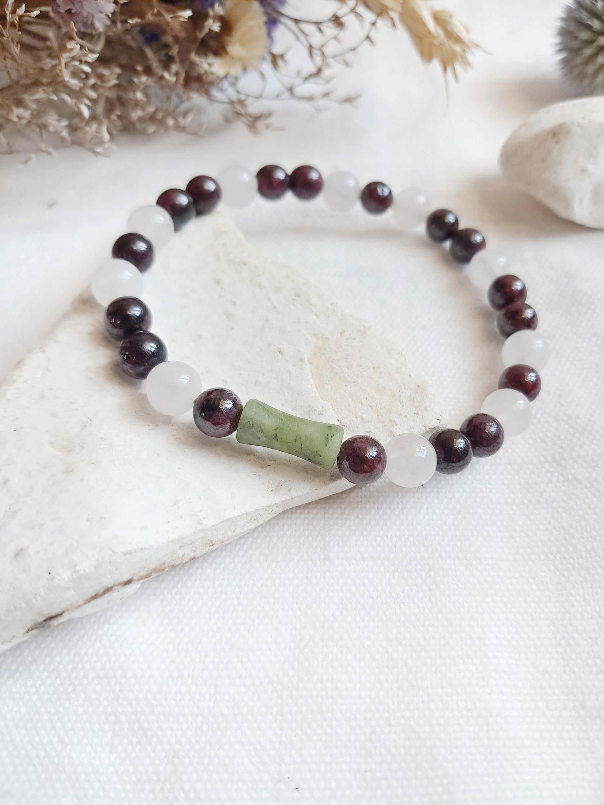 Nezuko Kamado est l'un des personnages principaux de Demon Slayer. Elle est la petite sœur de Tanjiro Kamado. Un bambou est fixé autour de sa mâchoire. Ce bambou nous le retrouvons en jade et en perle centrale sur ce bracelet. Il est accompagné de perles grenat, quartz rose de 6mm.