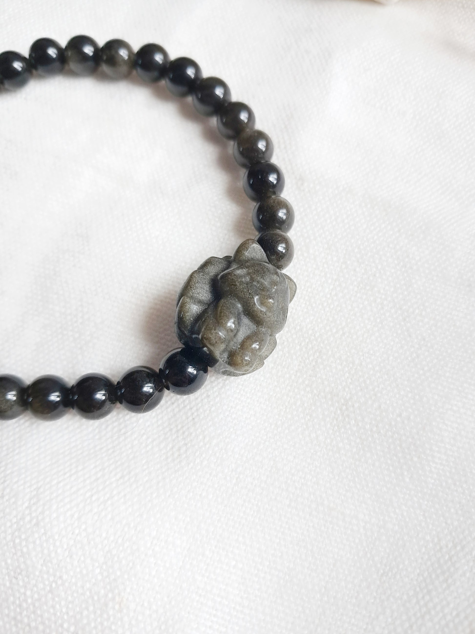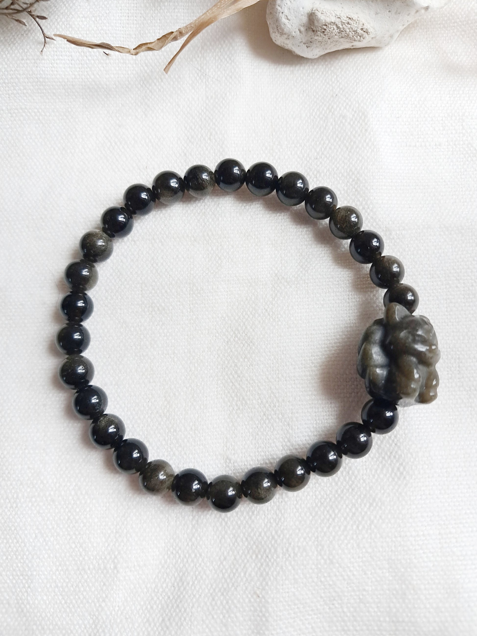 Ce bracelet est une création artisanale réalisée avec des perles naturelles en obsidienne dorée de 6mm de diamètre et sa perle sculptée centrale en forme de renard à neuf queue.