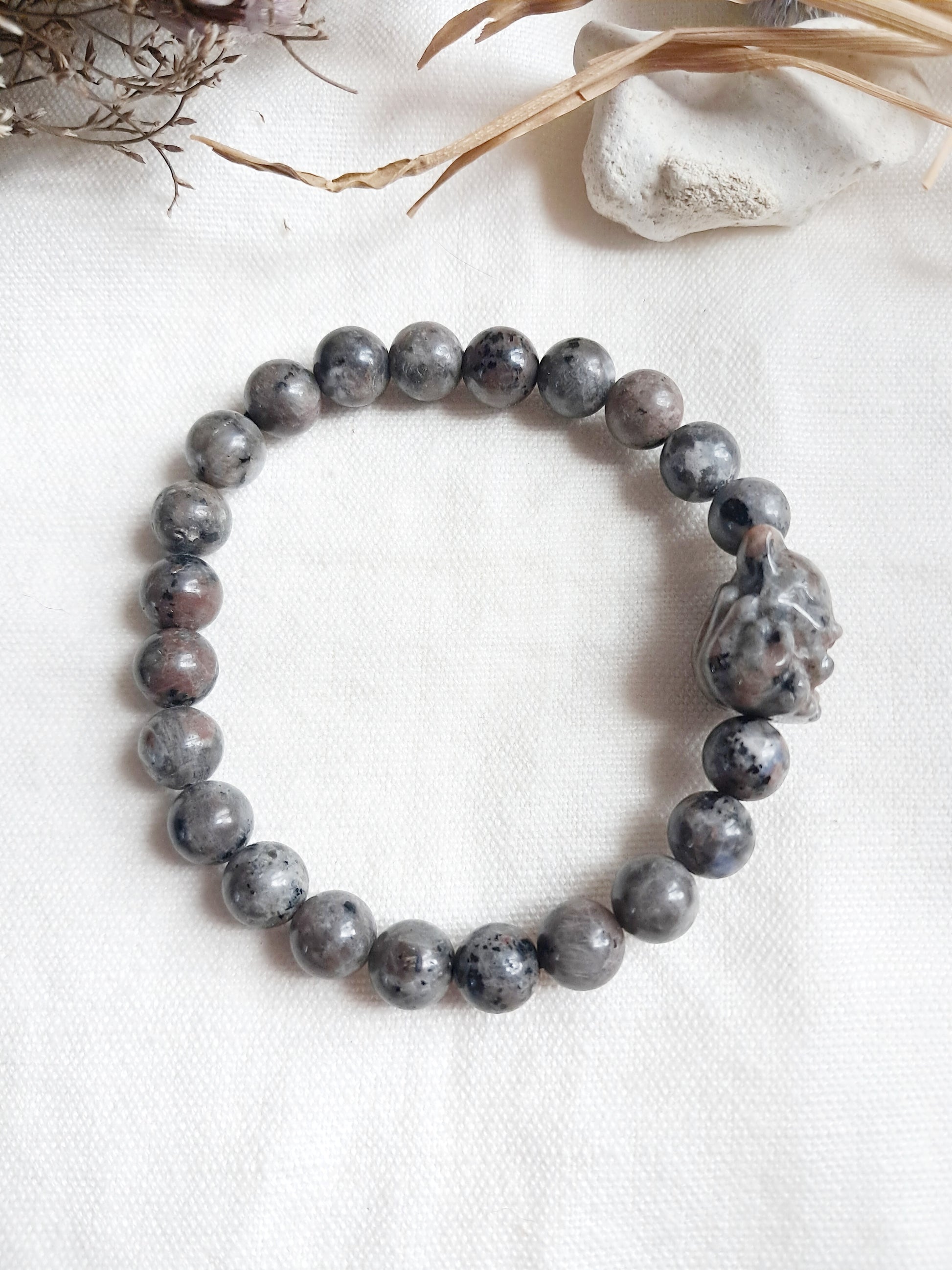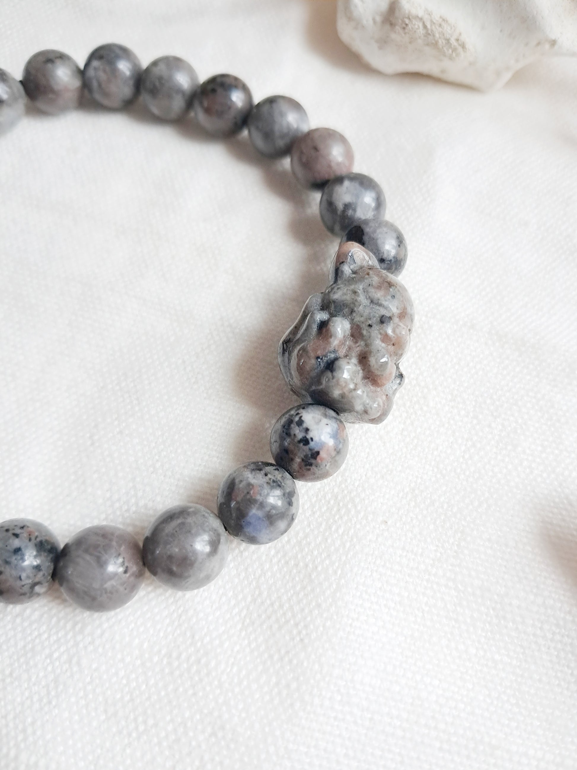 Ce bracelet est une création artisanale réalisée avec des perles naturelles en yooperlite de 8mm de diamètre et une perle sculptée centrale en forme de renard à neuf queues.