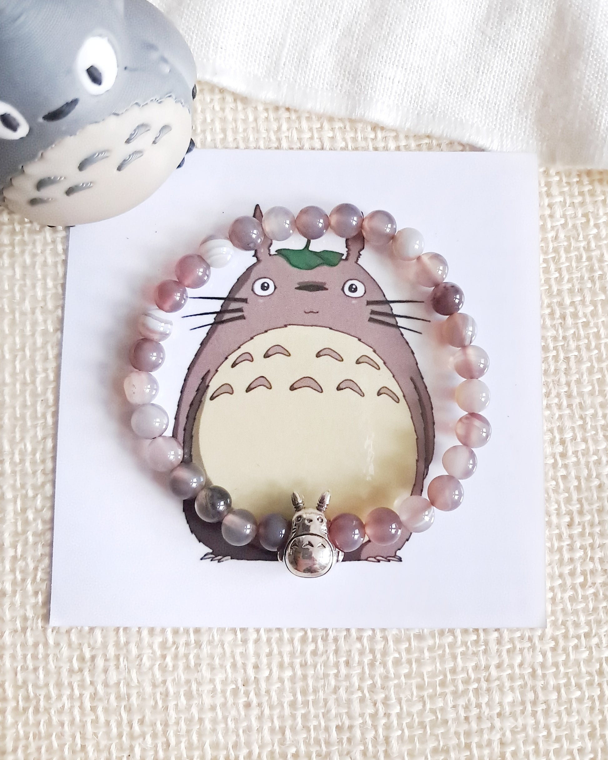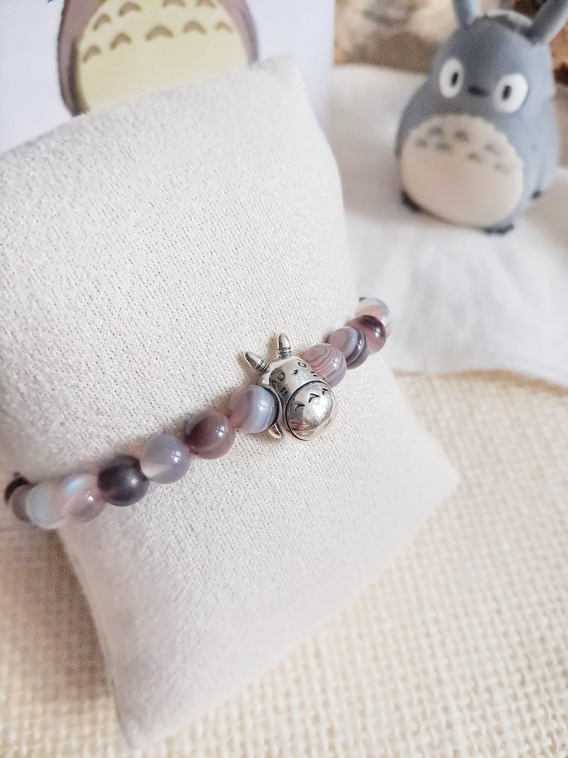 Totoro est un personnage du film "Mon voisin Totoro". C'est un esprit de la forêt de plus de 3000 ans qui apparait sous la forme d'un animal, croisement d'un chat, d'une couette et d'un panda. En son honneur nous avons créé ce bracelet en perles naturelles agate Botswana de 6mm avec sa breloque en argent 925.