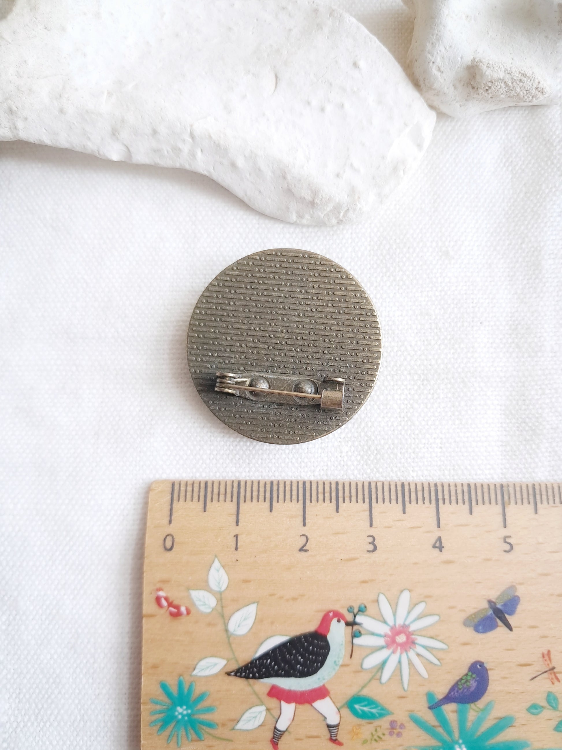 Cette broche cabochon est réalisée en métal et en verre. Le support porte un décor de fleurs et l'image représente le tableau de Van Gogh "Amandier en fleurs".