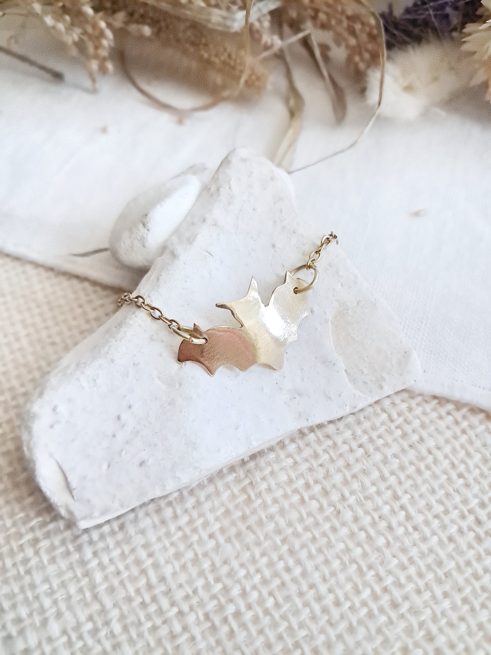 La chaîne est en acier inoxydable doré et la chauve-souris en laiton découpée et texturée à la main. La chauve-souris est une pièce unique qui ne peut être reproduite à l'identique.