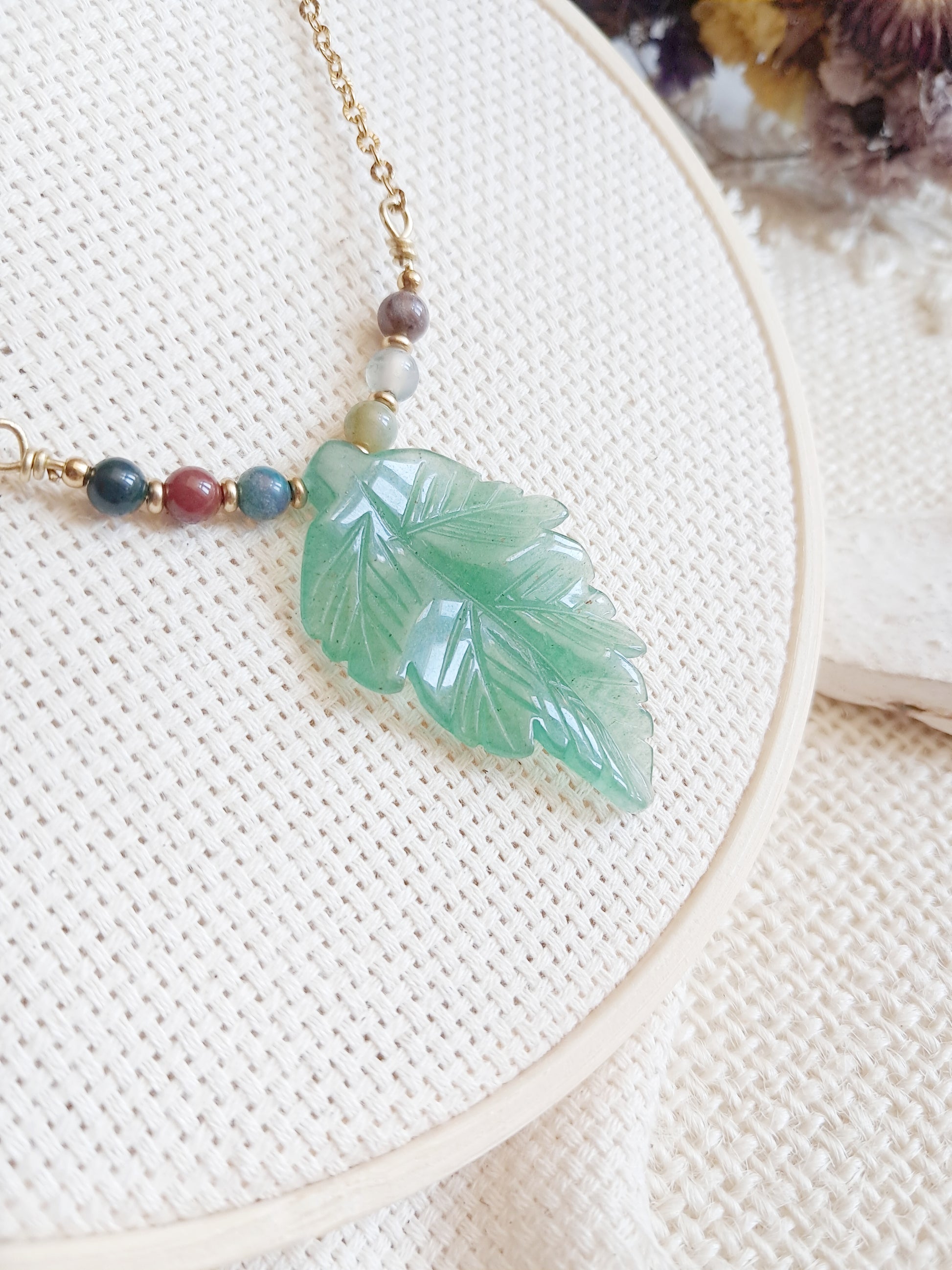 Ce collier feuille est en aventurine verte et agate indienne. La chaîne est en acier inoxydable doré.