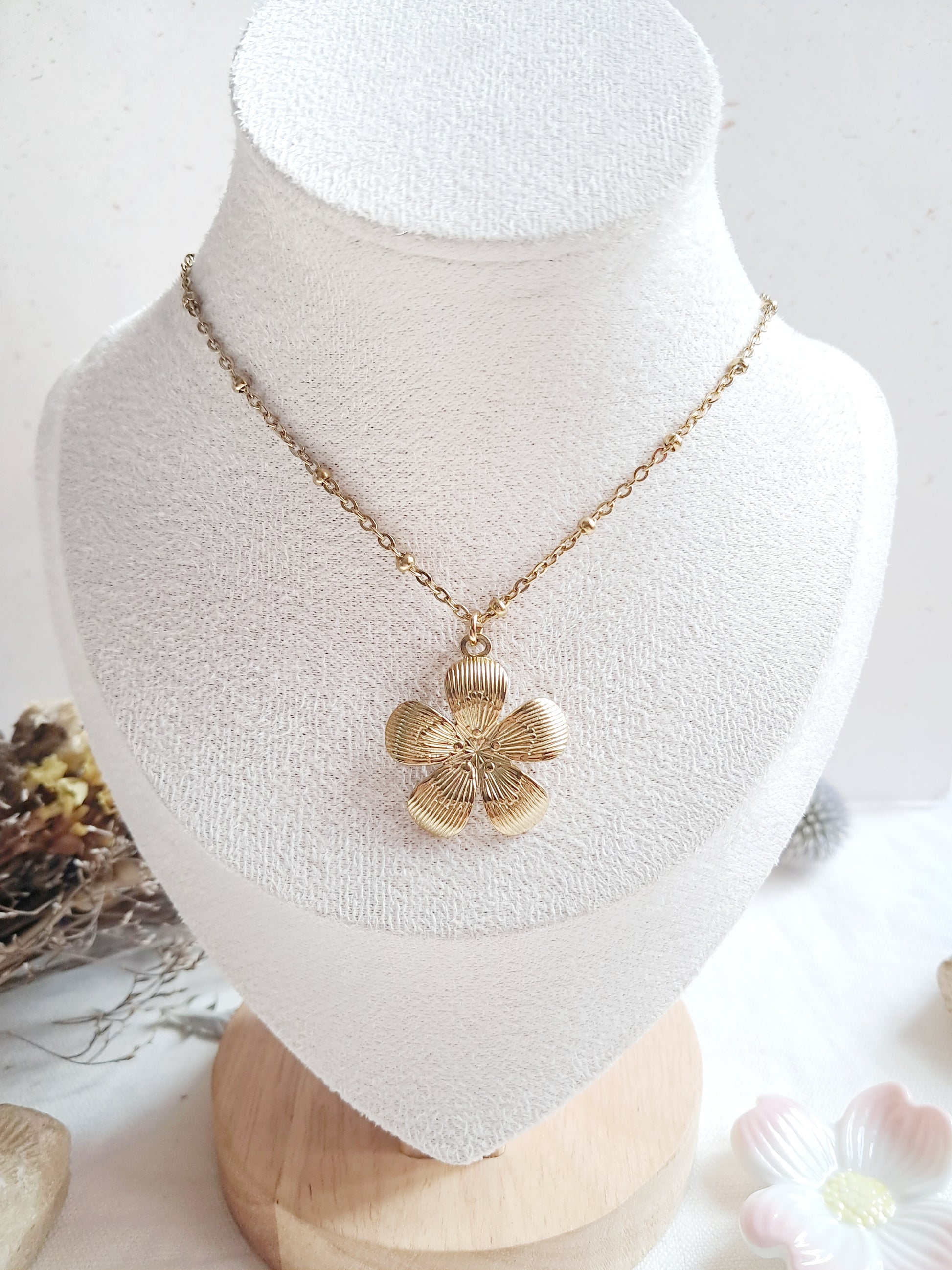 Ce collier fleur est réalisé dans notre atelier. La chaîne et le pendentif sont en acier inoxydable doré.