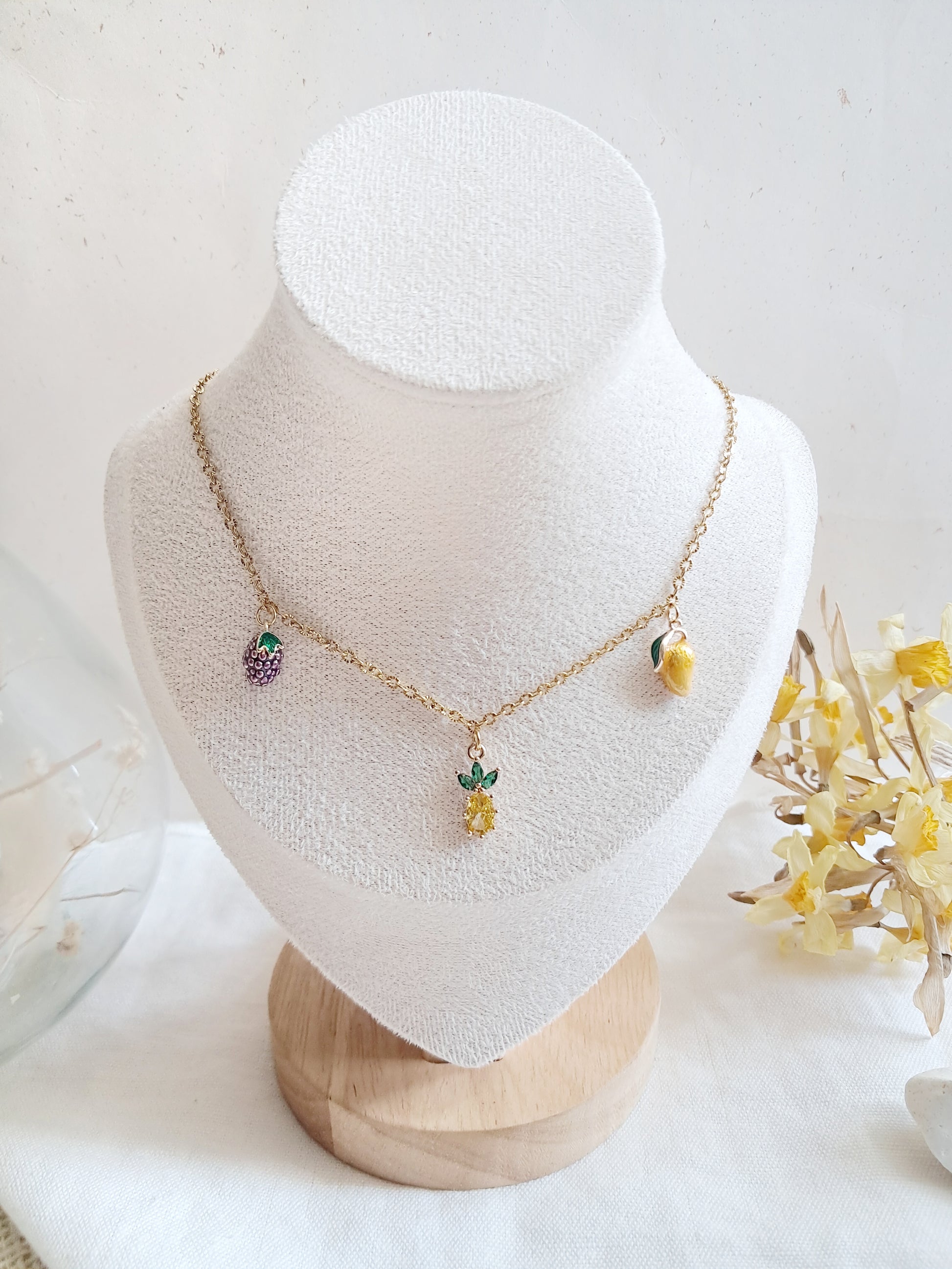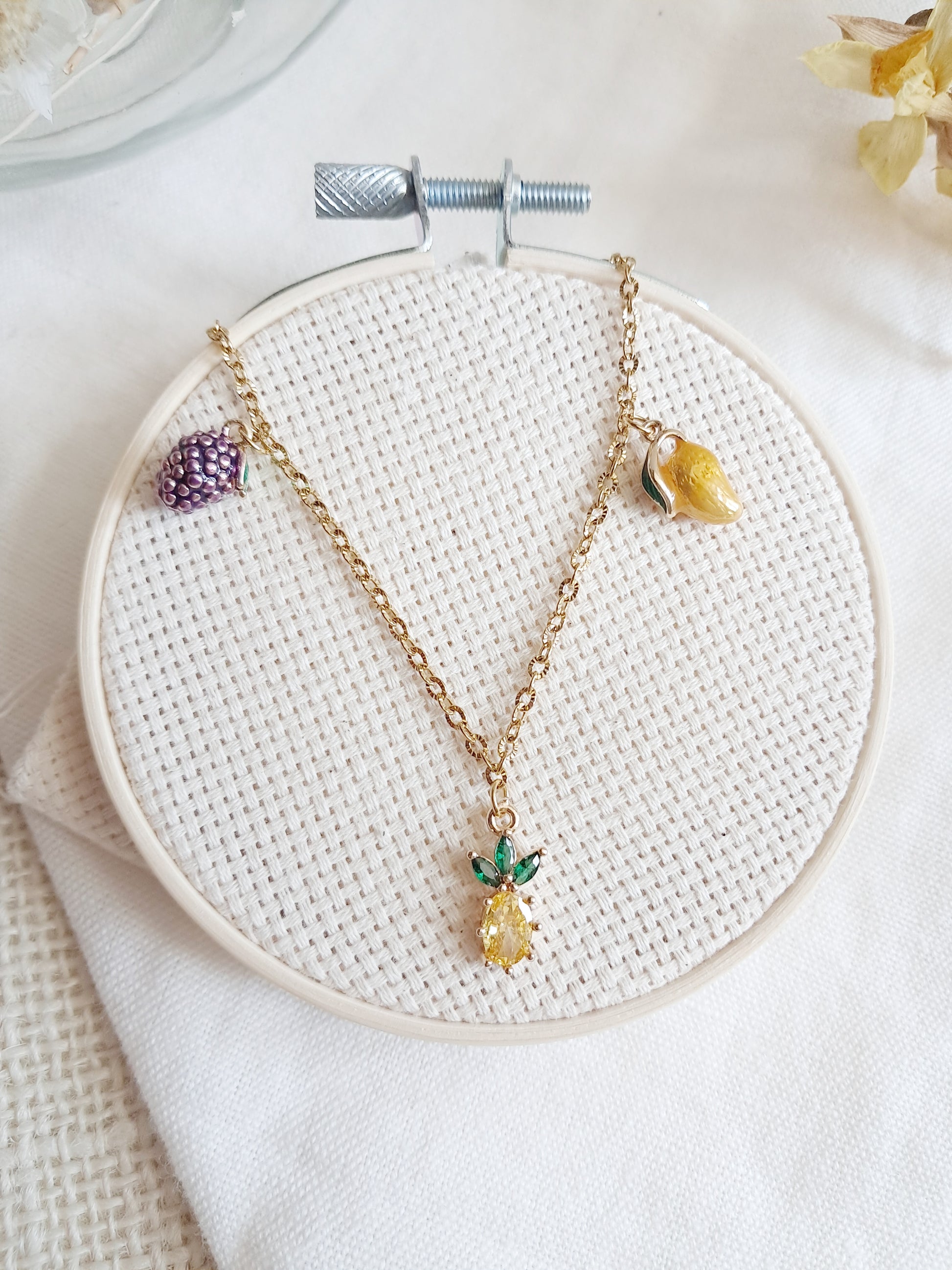 Ce collier fruits est réalisé dans notre atelier. La chaîne est en acier inoxydable doré et les fruits en laiton or 18k émaillé.