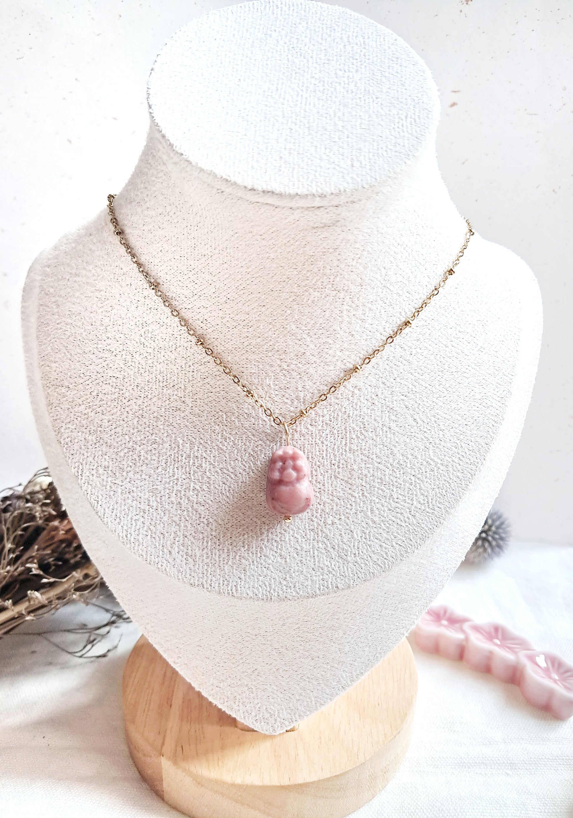 Ce collier pixiu est réalisé dans notre atelier. La chaîne est en acier inoxydable doré et le pixiu est en rhodonite.