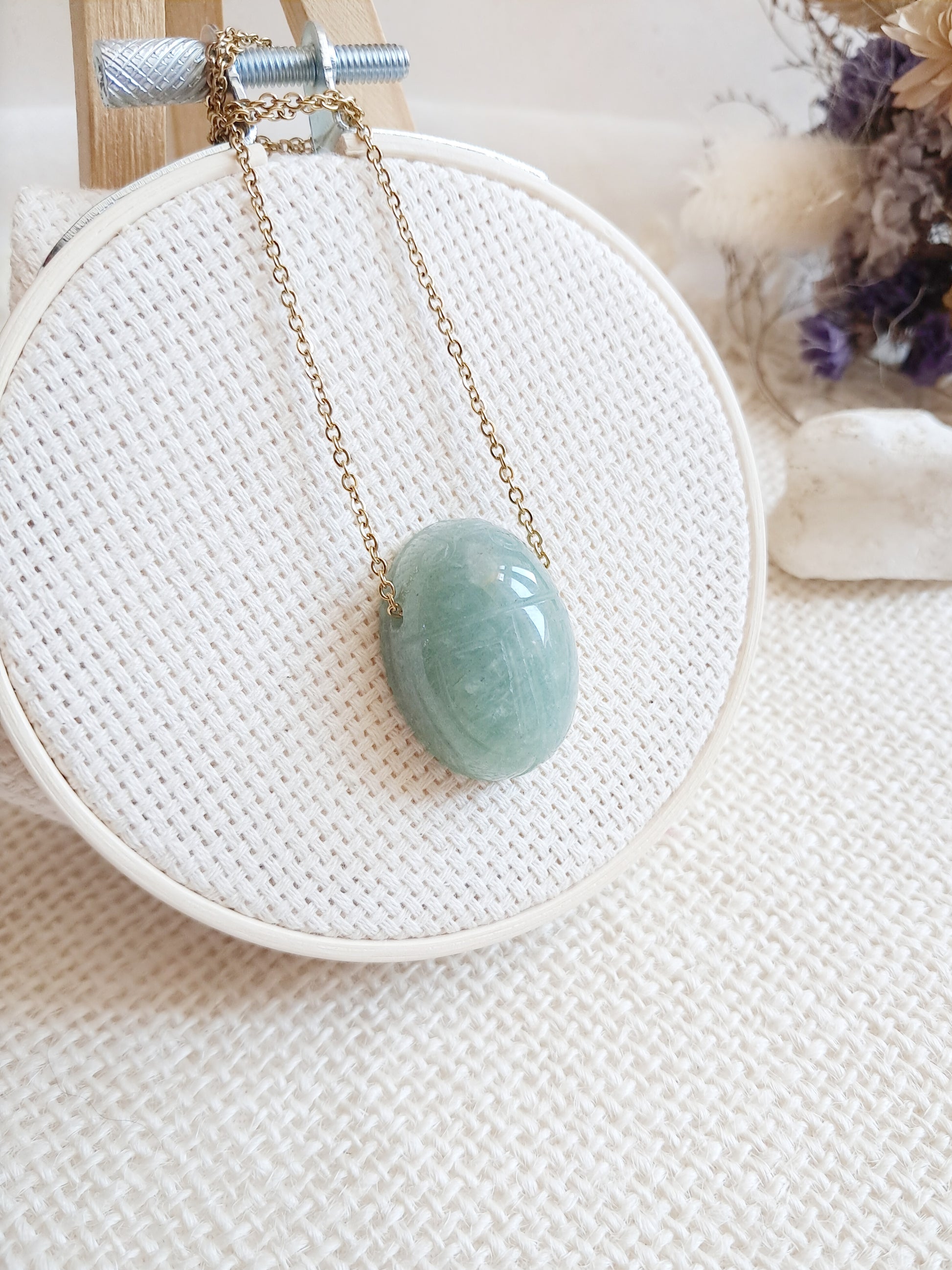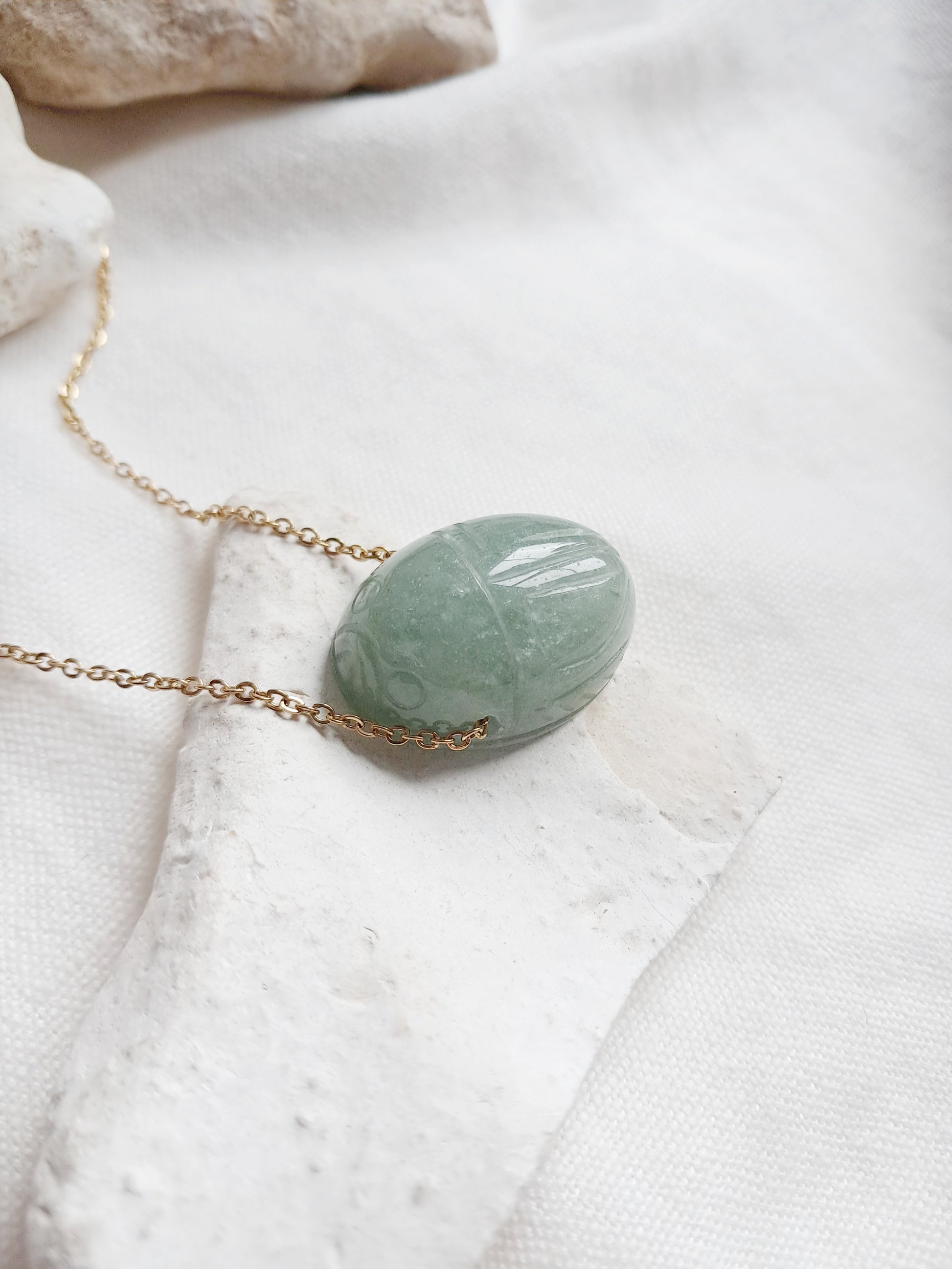 Ce collier scarabée est en aventurine verte et sa chaîne est en acier inoxydable doré d'environ 45cm.