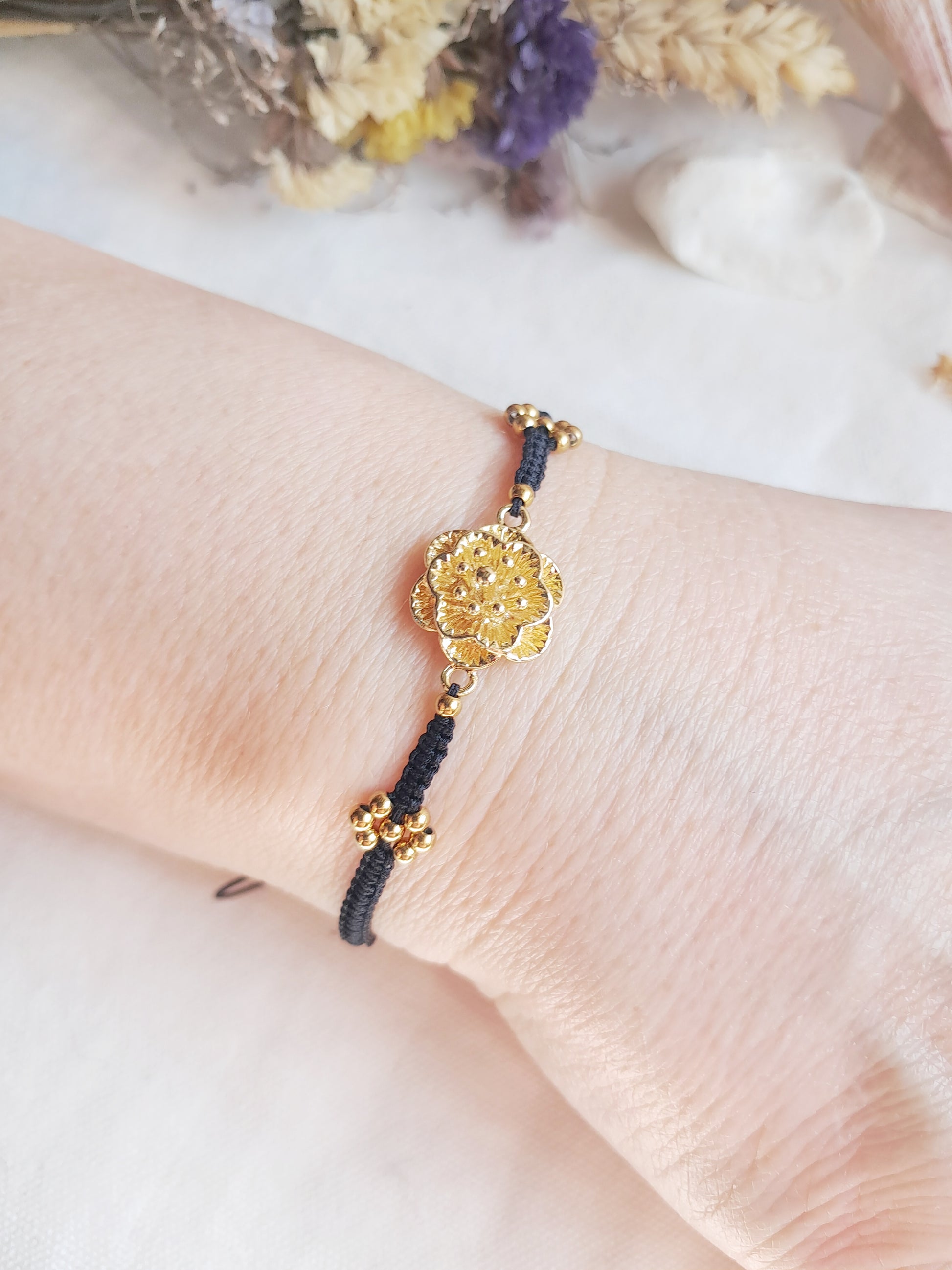 Ce bracelet shamballa est une création faite main réalisée avec une perle fleur de lotus en laiton or 24k et des perles en acier inoxydable doré.