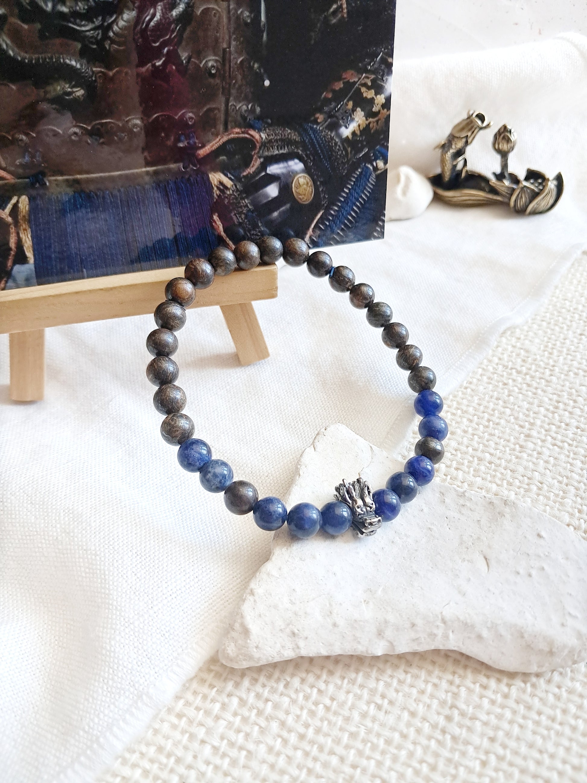 Ce bracelet est une création faite main réalisée avec des perles naturelles en bronzite et sodalite de 6mm de diamètre, avec sa perle dragon en acier inoxydable.