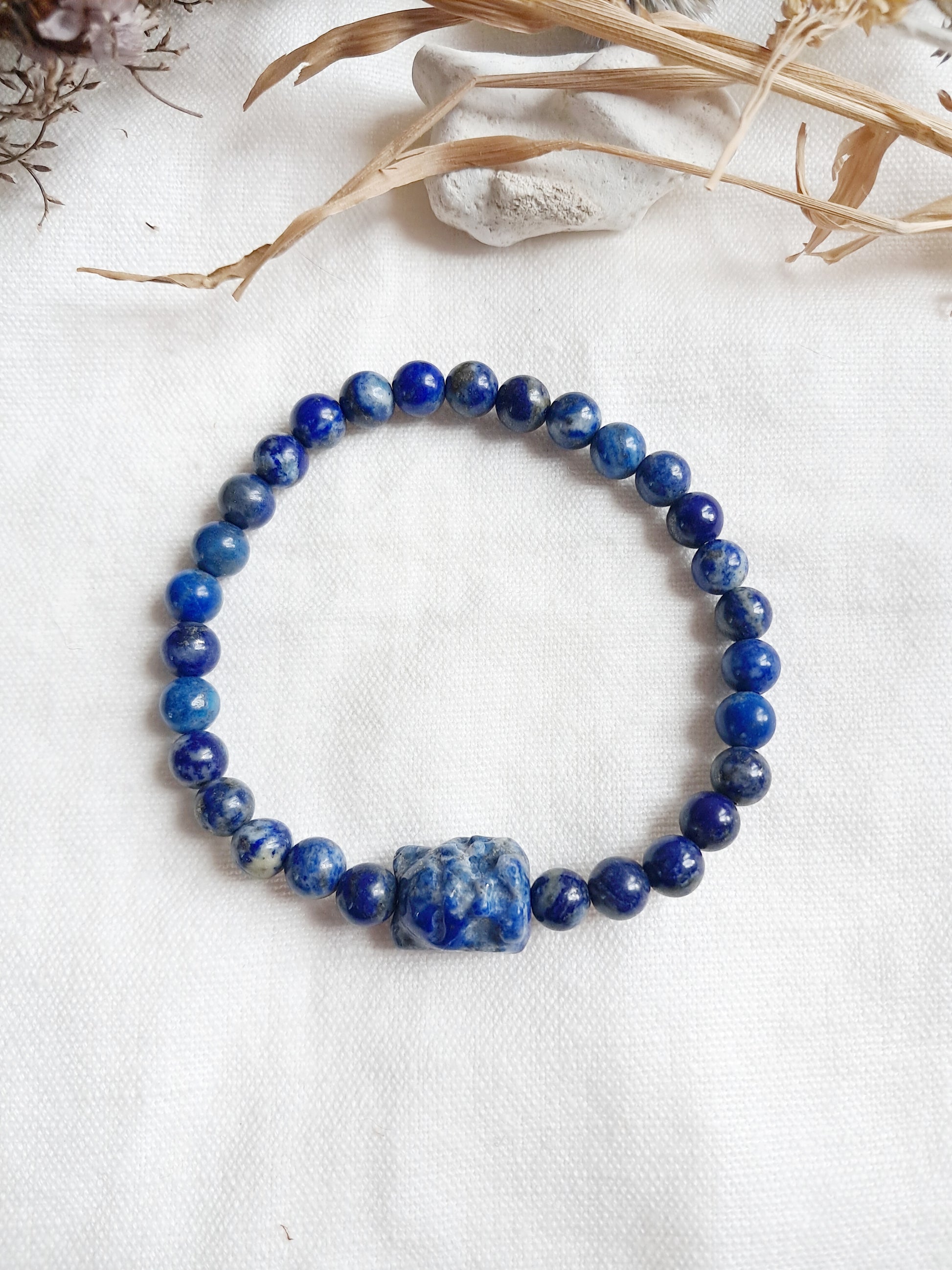 Ce bracelet est une création artisanale réalisée avec des perles naturelles en lapis-lazuli de 6mm de diamètre et sa perle sculptée centrale en forme de renard à neuf queue.