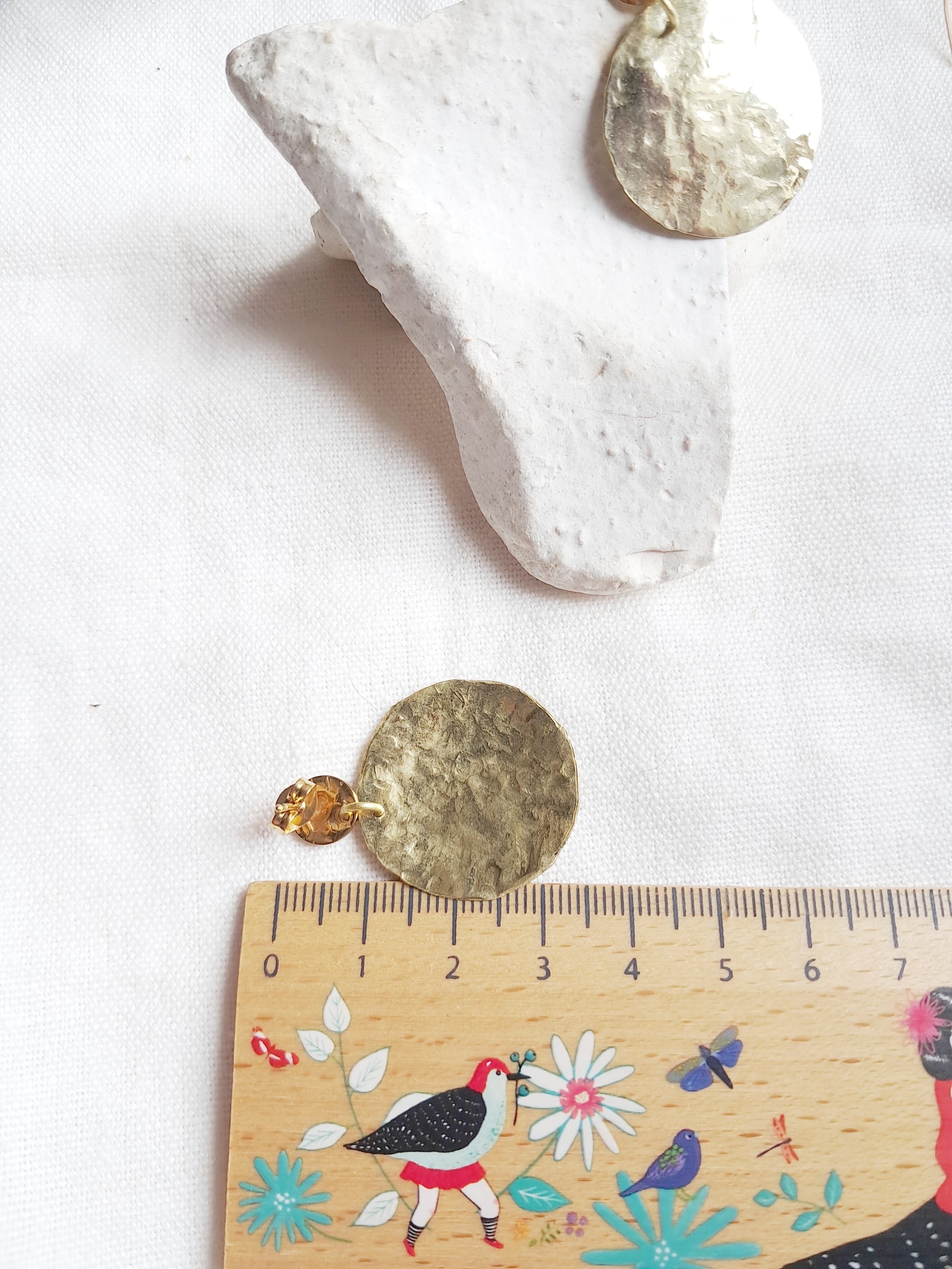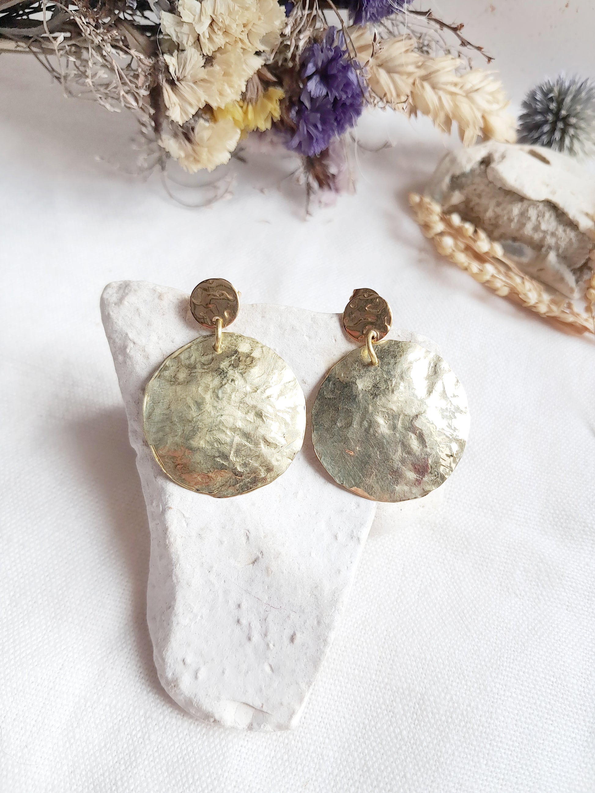 Cette paire de boucles d'oreilles artisanale est réalisée à la main dans notre atelier. Les disques en laiton sont découpés et tapés, puis montés sur des clous hypoallergéniques (24k).