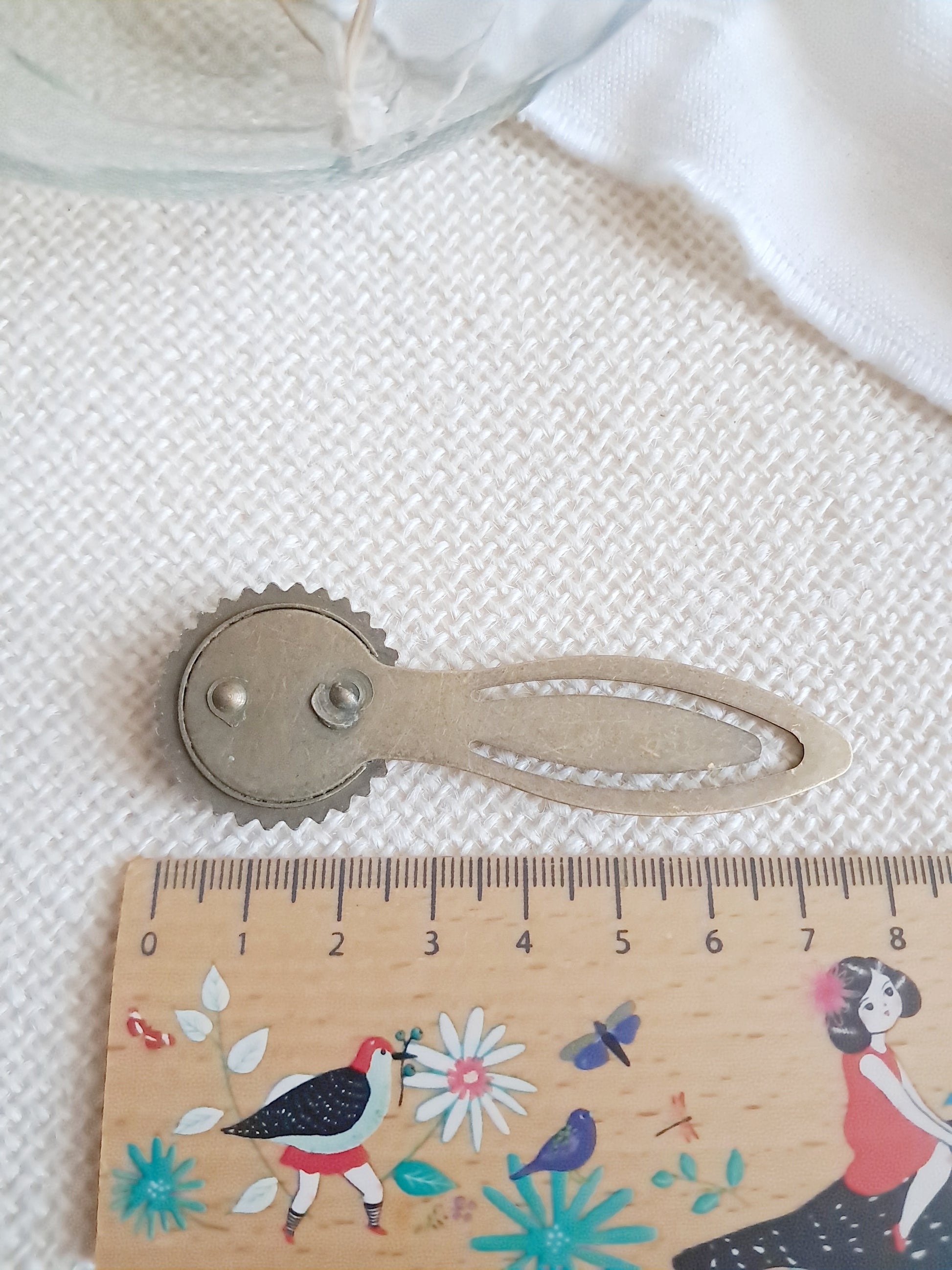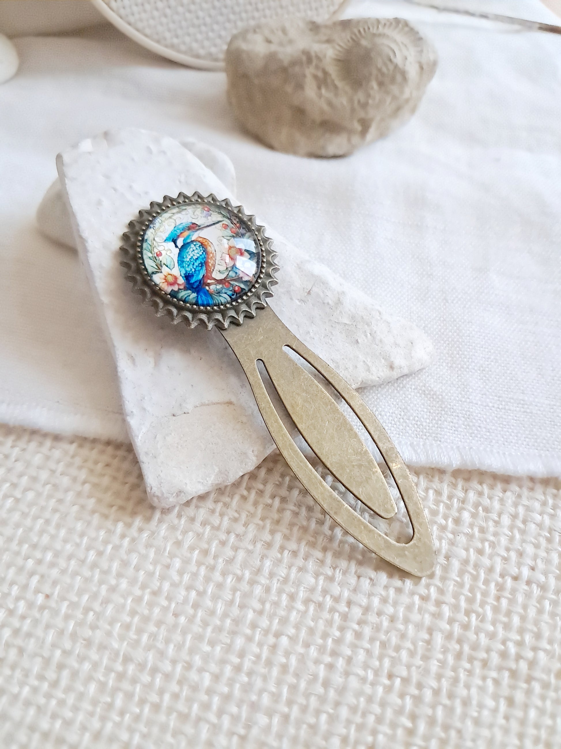 Marque-pages cabochon Martin pêcheur en verre et métal.