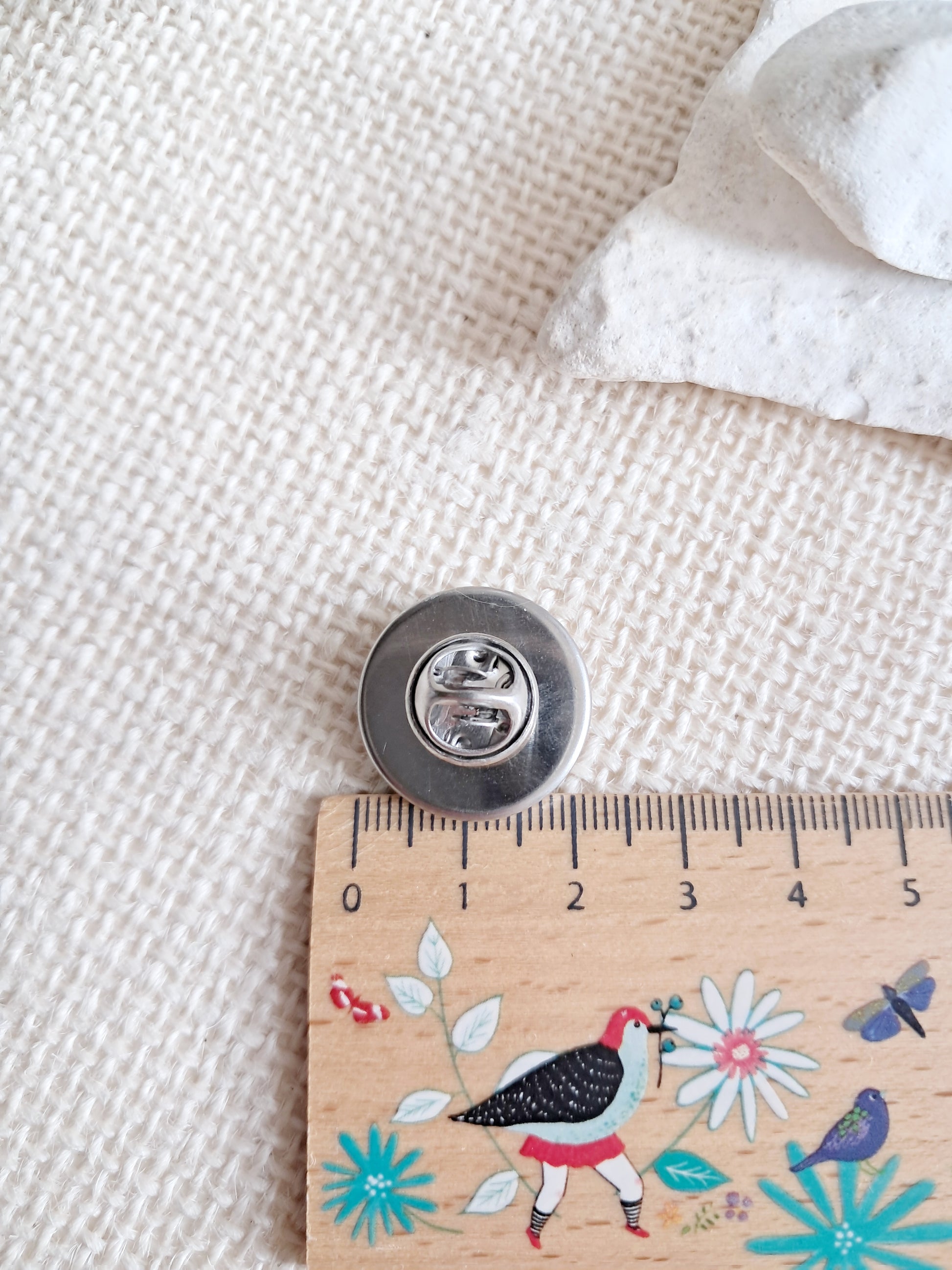 Cet pin's cabochon est réalisé en acier inoxydable et en verre. L'image représente une illustration de Cinnamoroll.