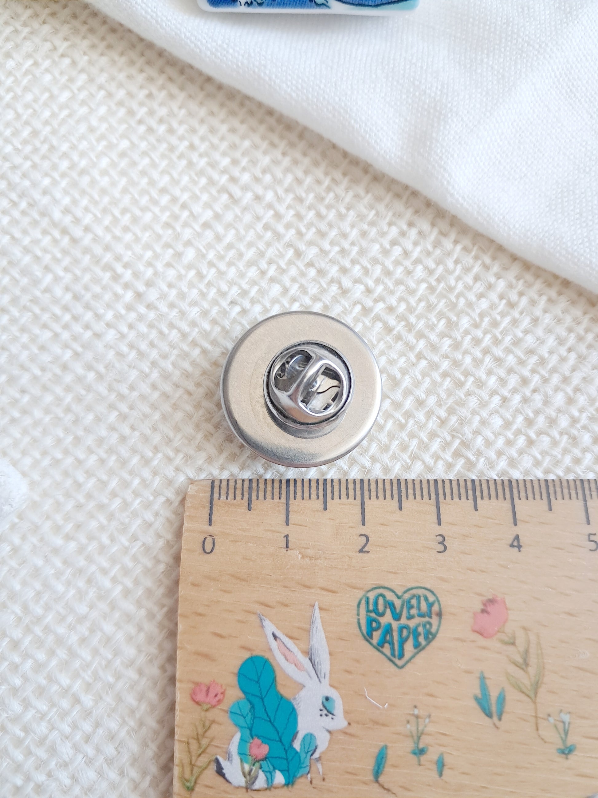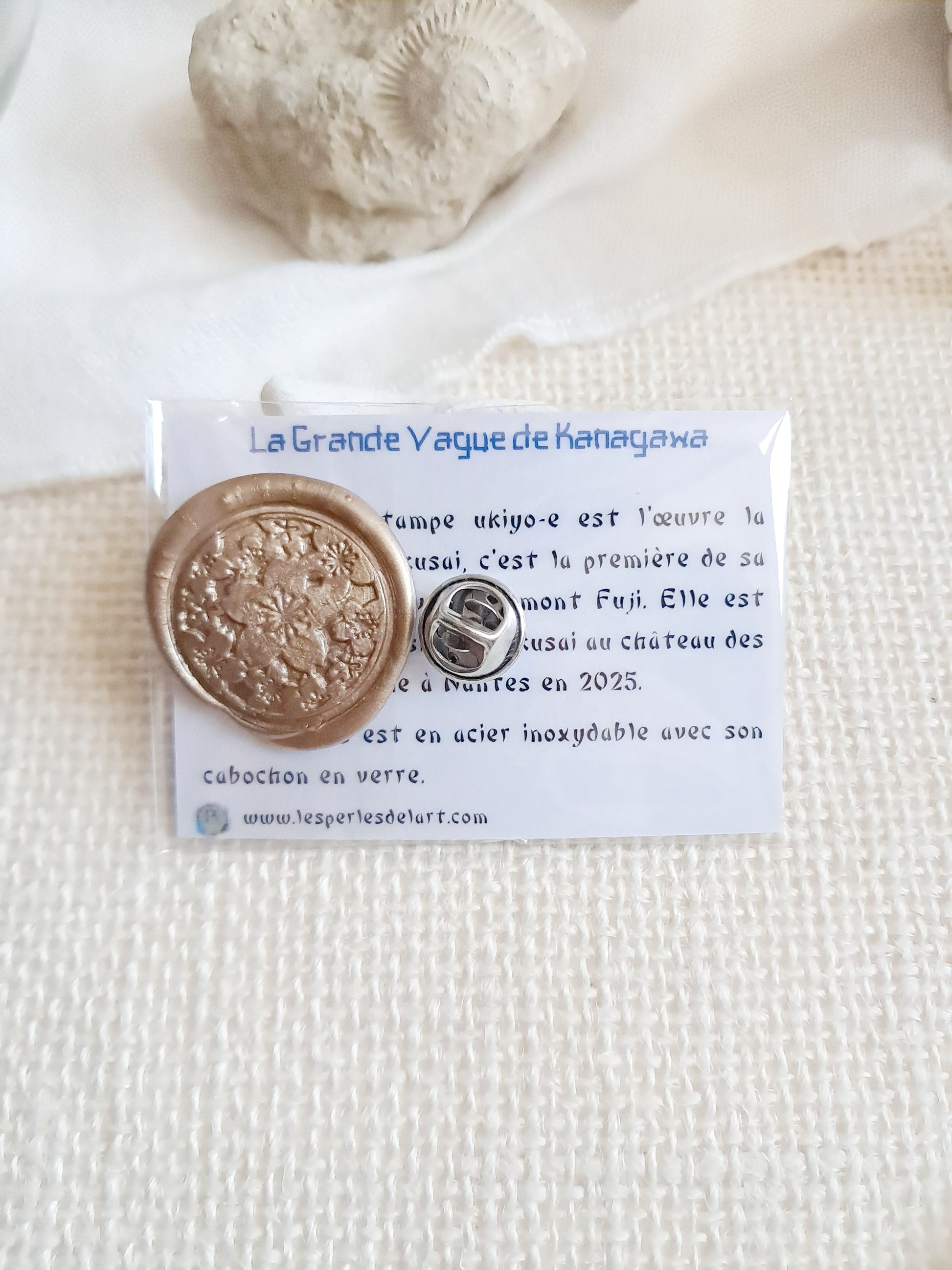 Ce pin's cabochon est réalisé en acier inoxydable et en verre. L'image représente une l'estampe "La grande vague de Kanagawa" par Hokusai.