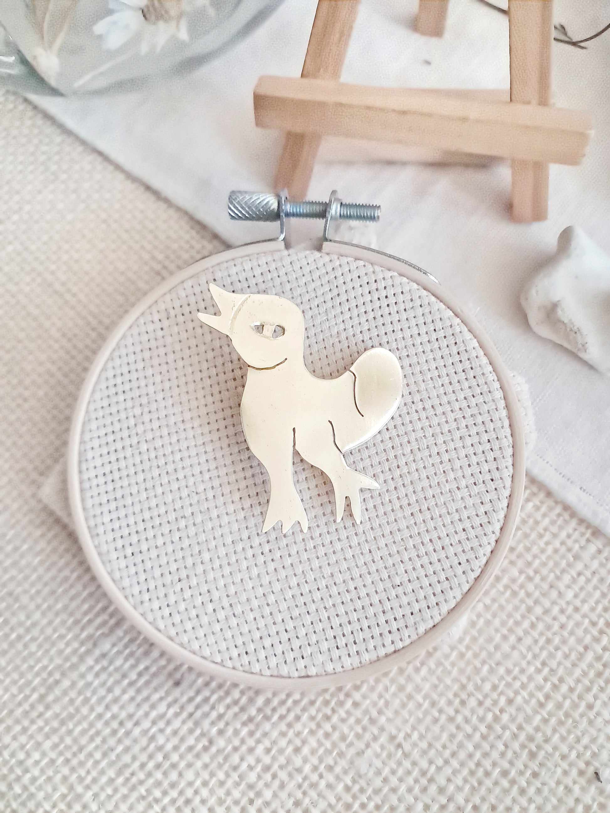 Ce pin's oiseau inspiré de Chagall est réalisé entièrement à la main. Il a été découpé à la scie dans une plaque de laiton.