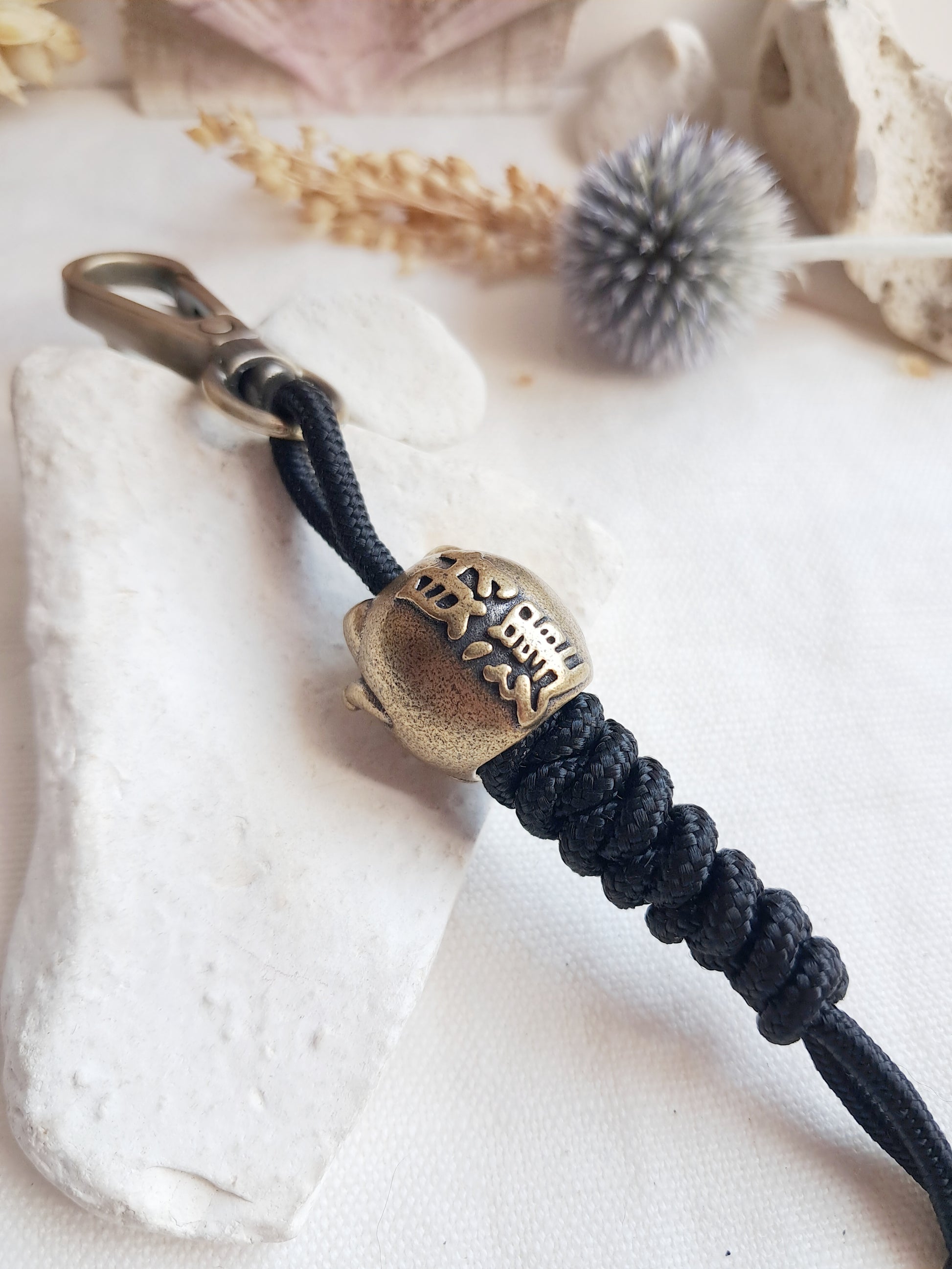 Ce porte-clés est fait d'une perle en laiton avec un tissage en fil de paracorde.